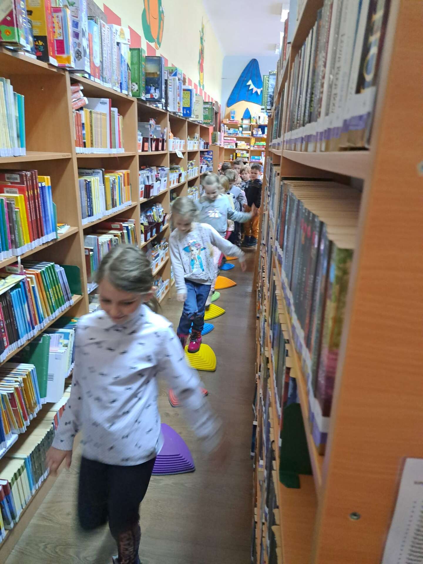 Dzieci idą między regałami z książeczkami