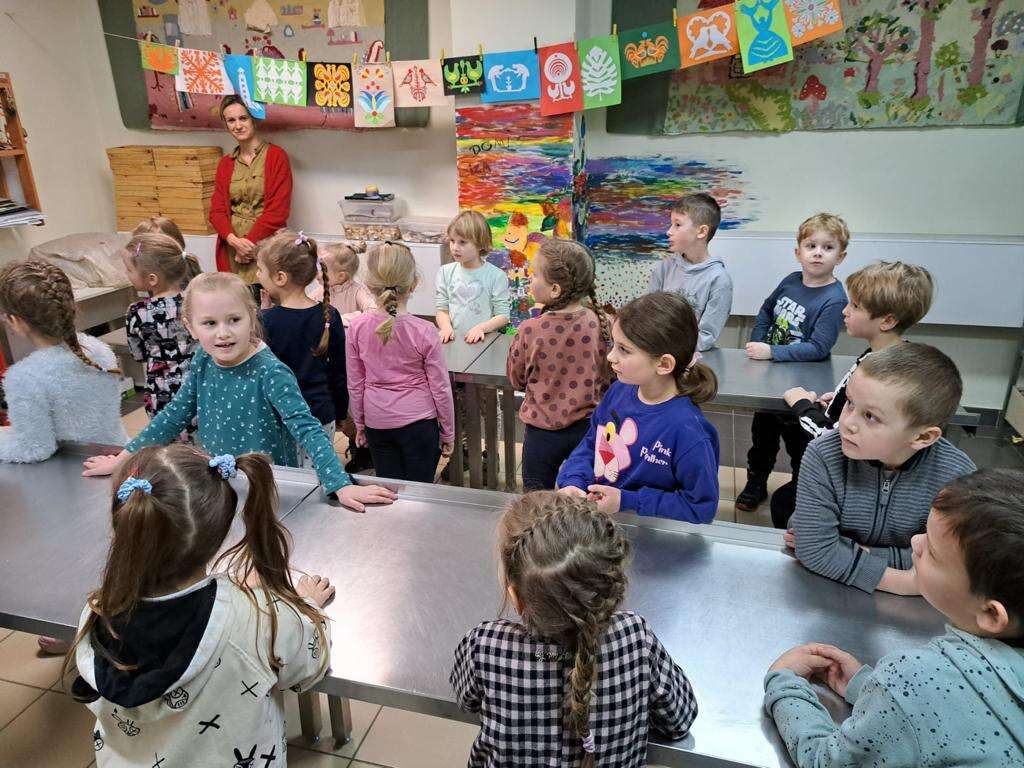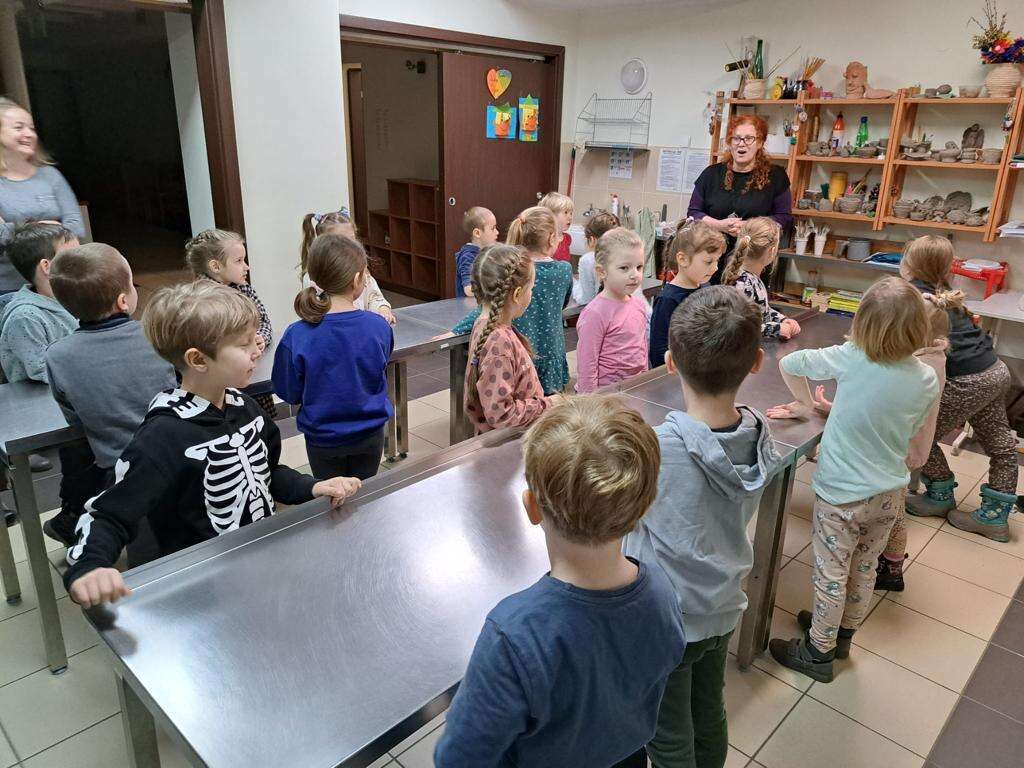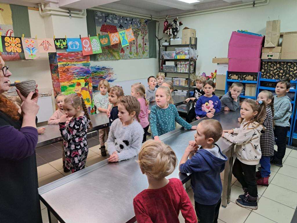 Pani tłumaczy dzieciom jak wykonać prace z gliny