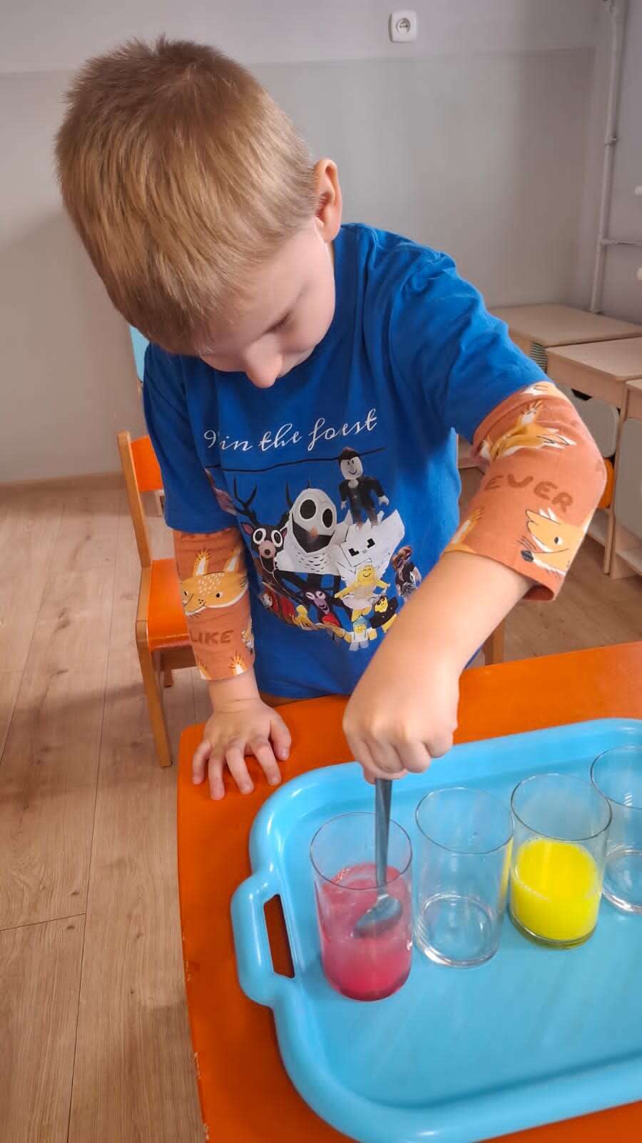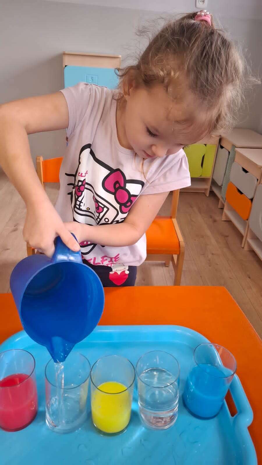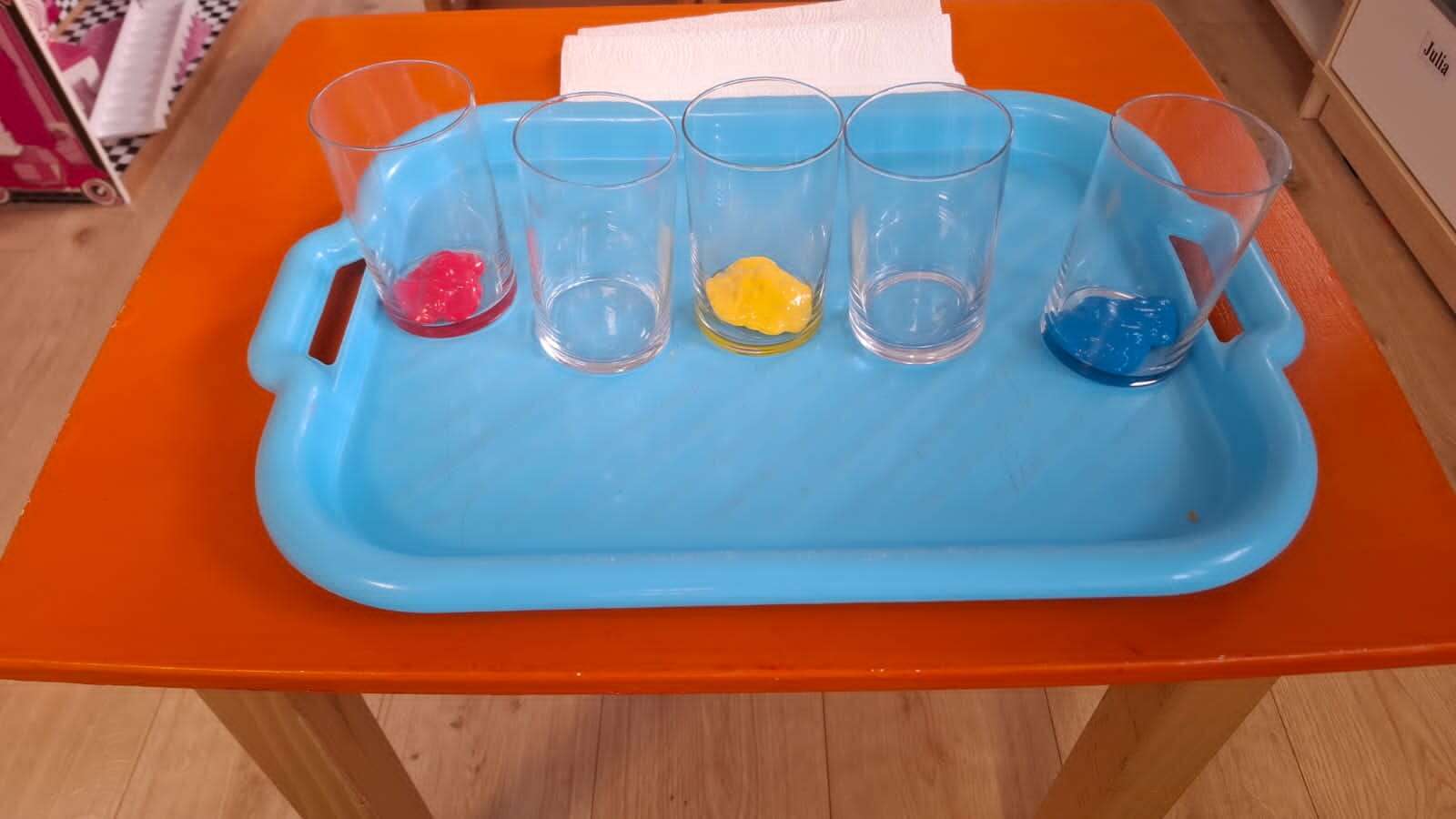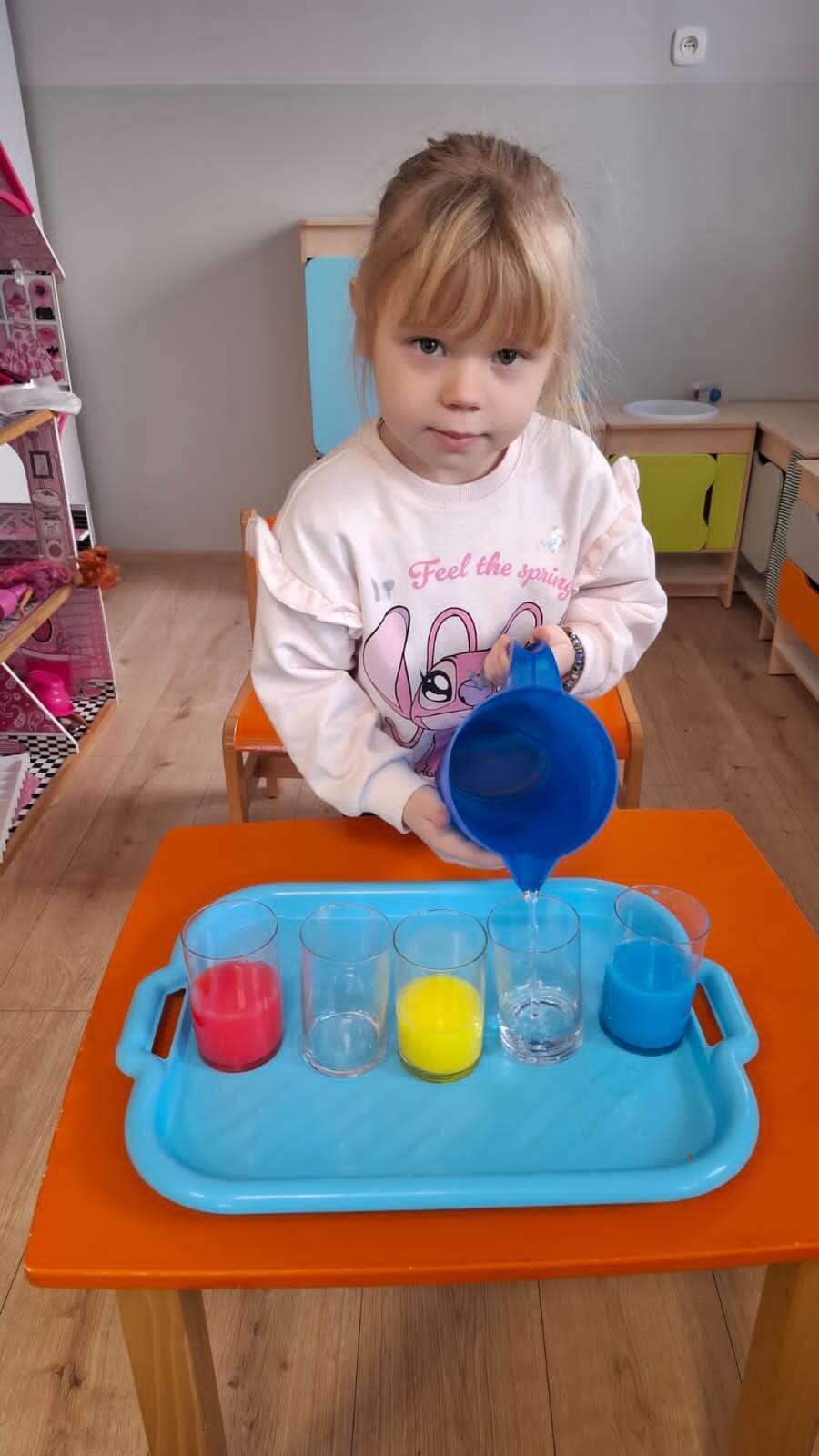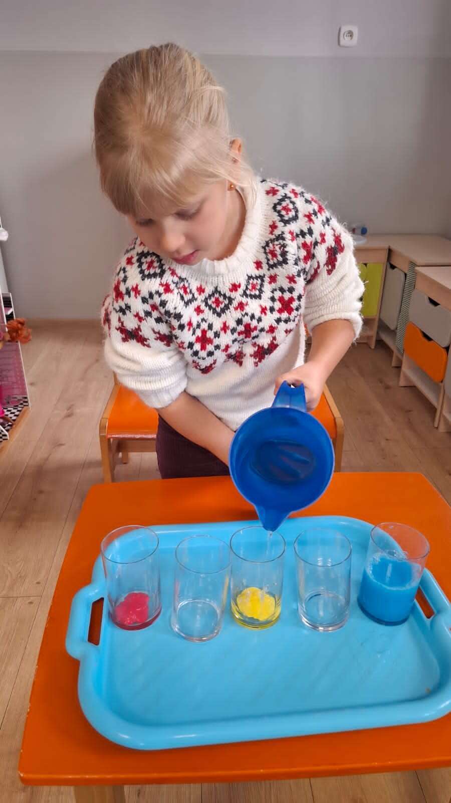 Świat, w kolorach.Eksperyment ze szklankami miał pokazać,że połączenie koloru żółtego i czerwonego, powstanie kolor pomarańczowy, a połączenie koloru żółtego z niebieskim daje kolor zielony.