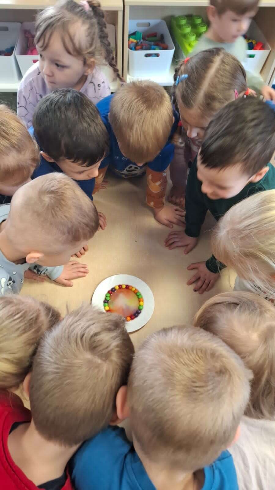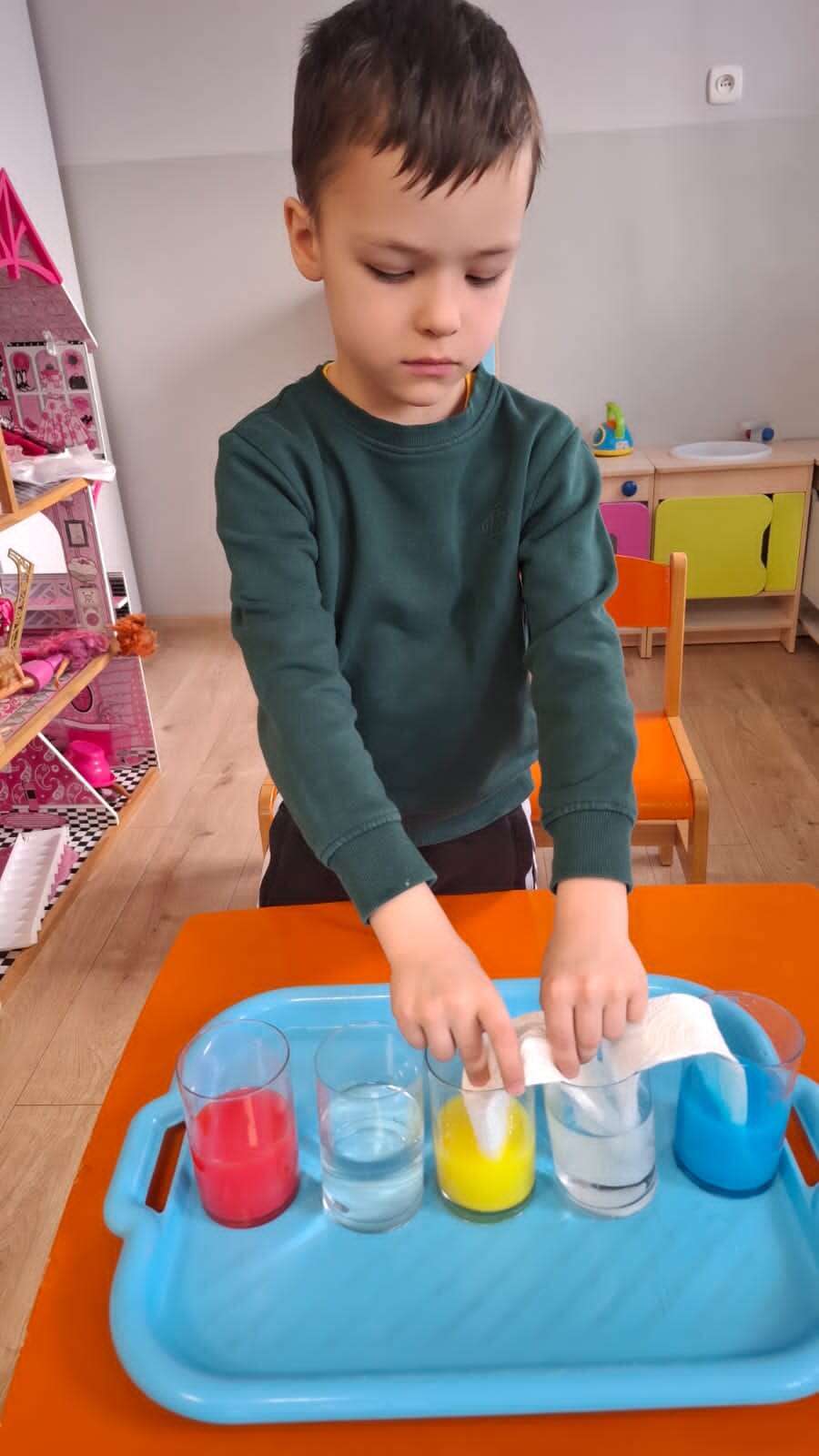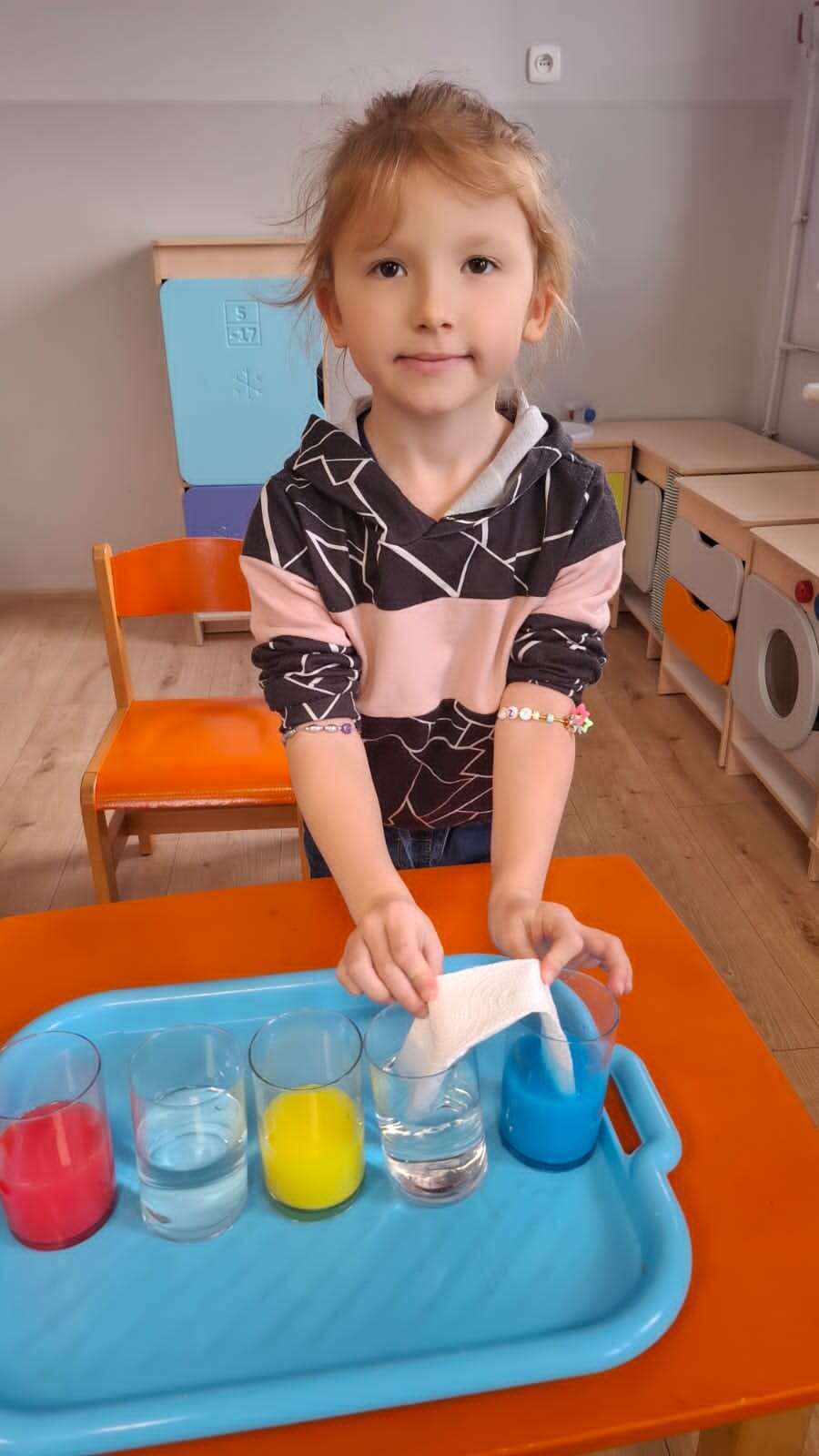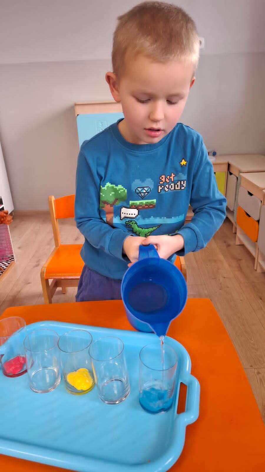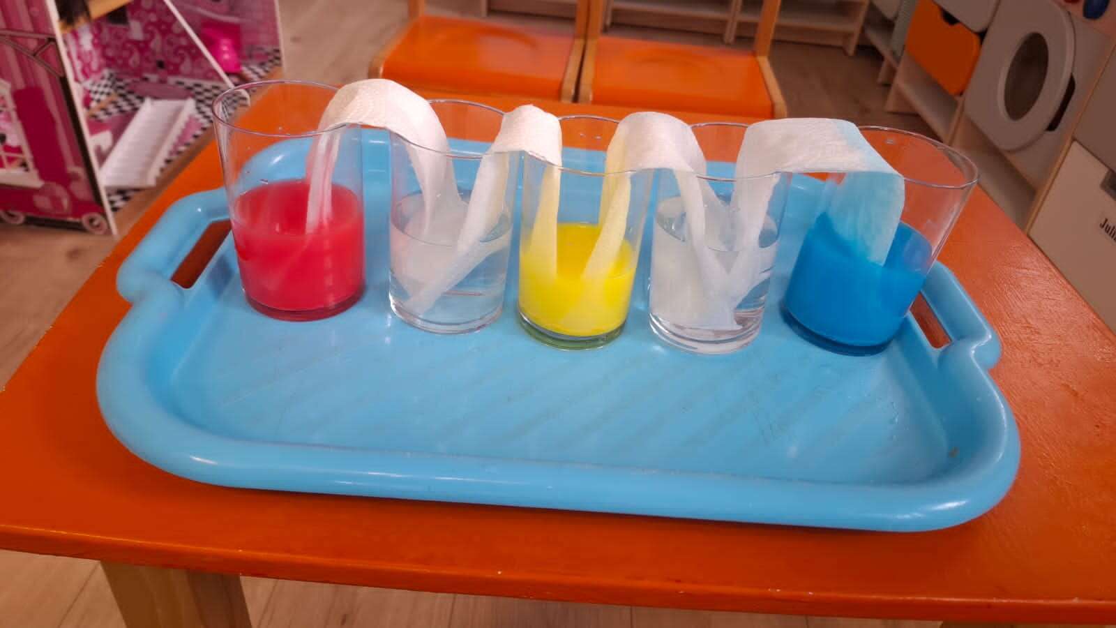 Świat, w kolorach.Eksperyment ze szklankami miał pokazać,że połączenie koloru żółtego i czerwonego, powstanie kolor pomarańczowy, a połączenie koloru żółtego z niebieskim daje kolor zielony.