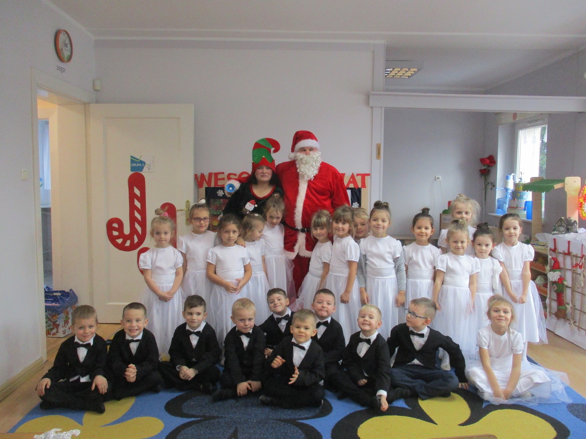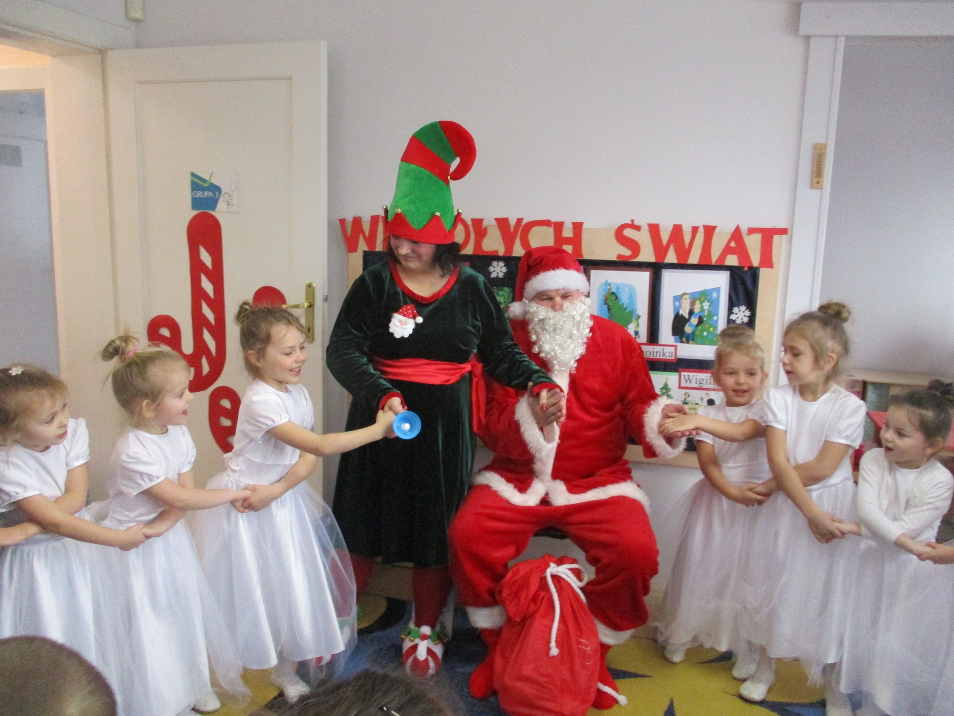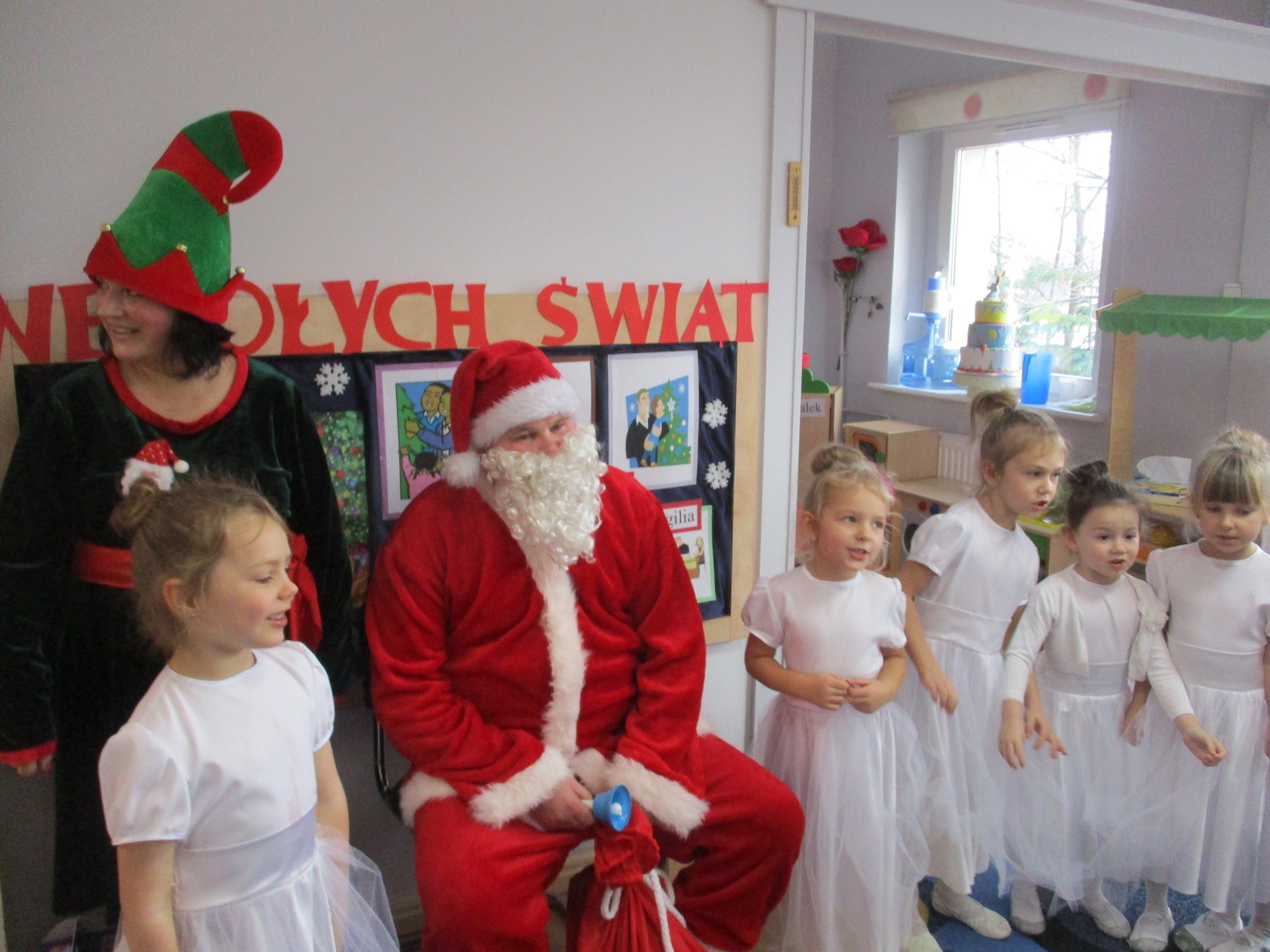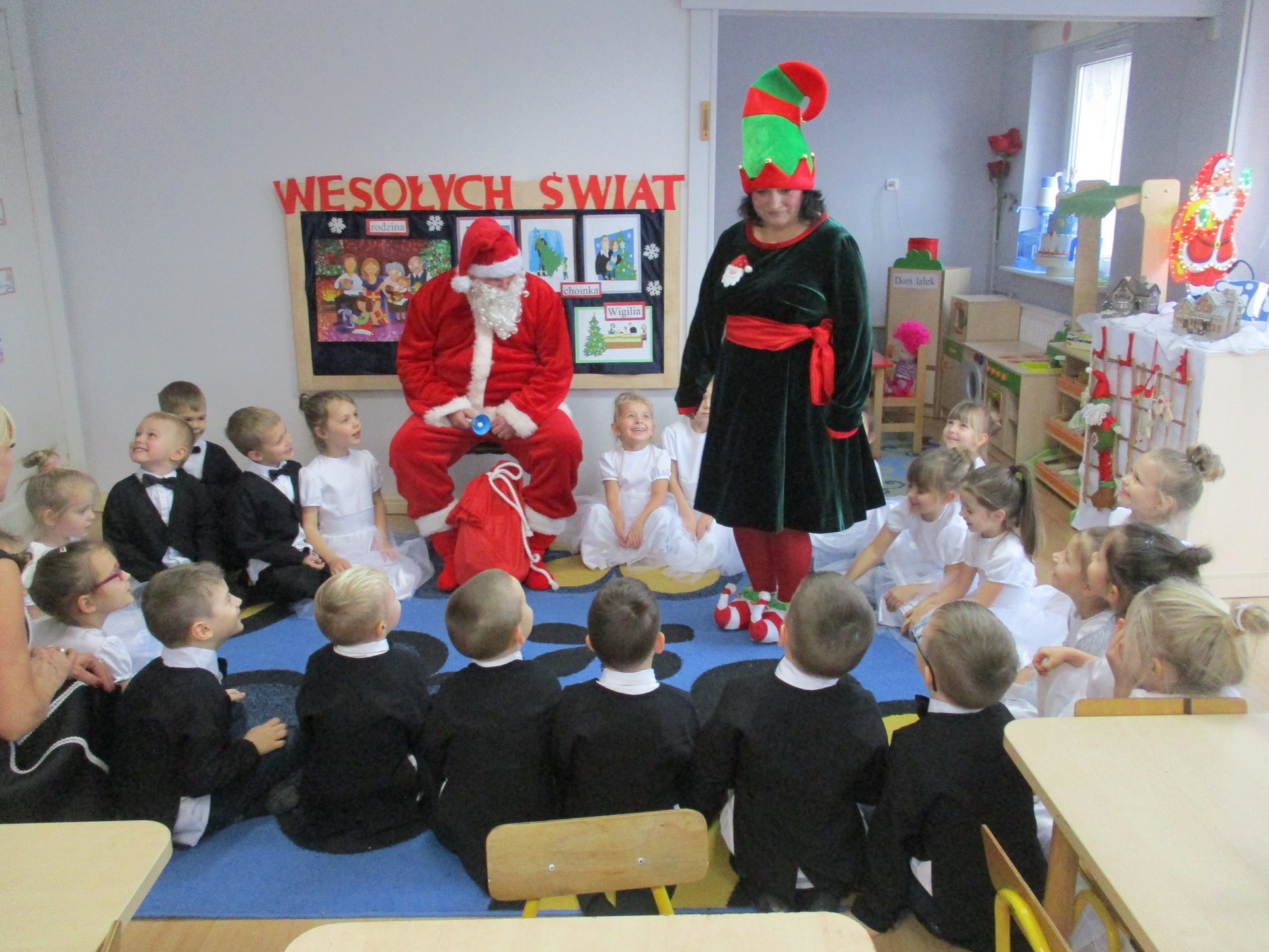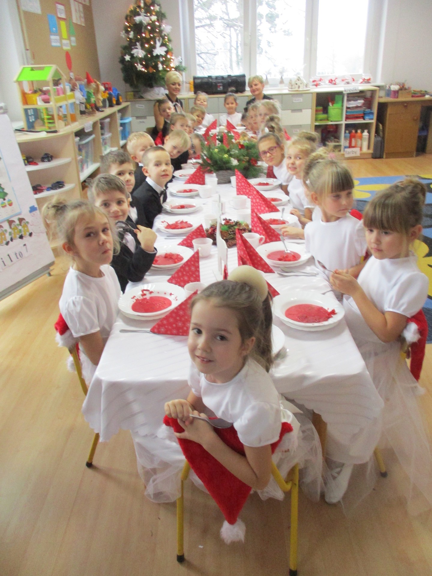 Wigilia Bożego Narodzenia to jeden z najpiękniejszych dni w roku, dlatego w naszej przedszkolnej rodzinie przeżywamy go bardzo uroczyście. Nasza przedszkolna wigilia odbyła się w piątek. Na początku dzieci zjadły wspólny posiłek. W dalszej części uroczystości dzieci odwiedził Mikołaj wraz z Elfem.Dzieliliśmy się również opłatkiem życząc sobie nawzajem wszelkiej pomyślności i Wesołych Świąt. Nasze spotkanie zakończyło się wspólnym kolędowaniem przy wigilijnym stole.