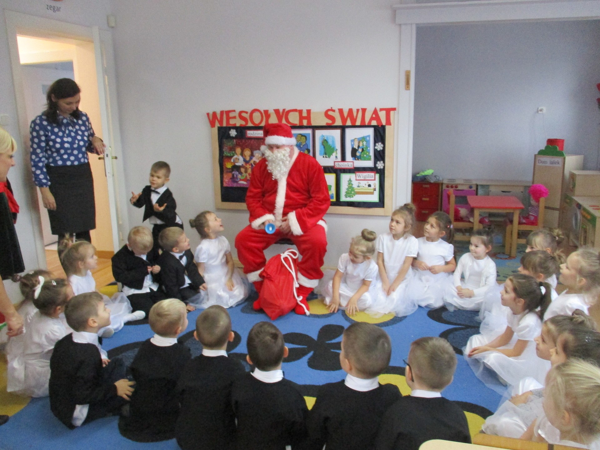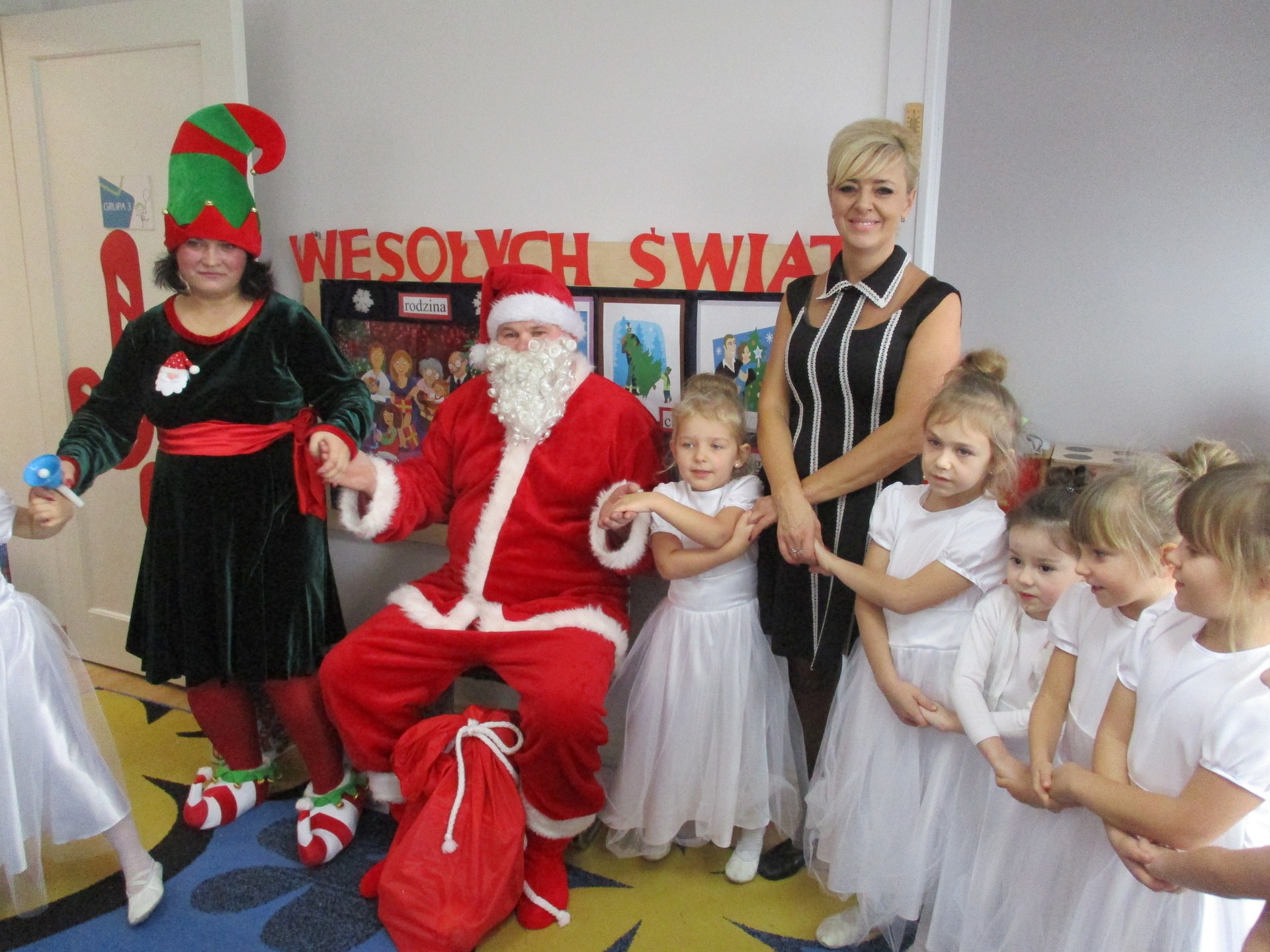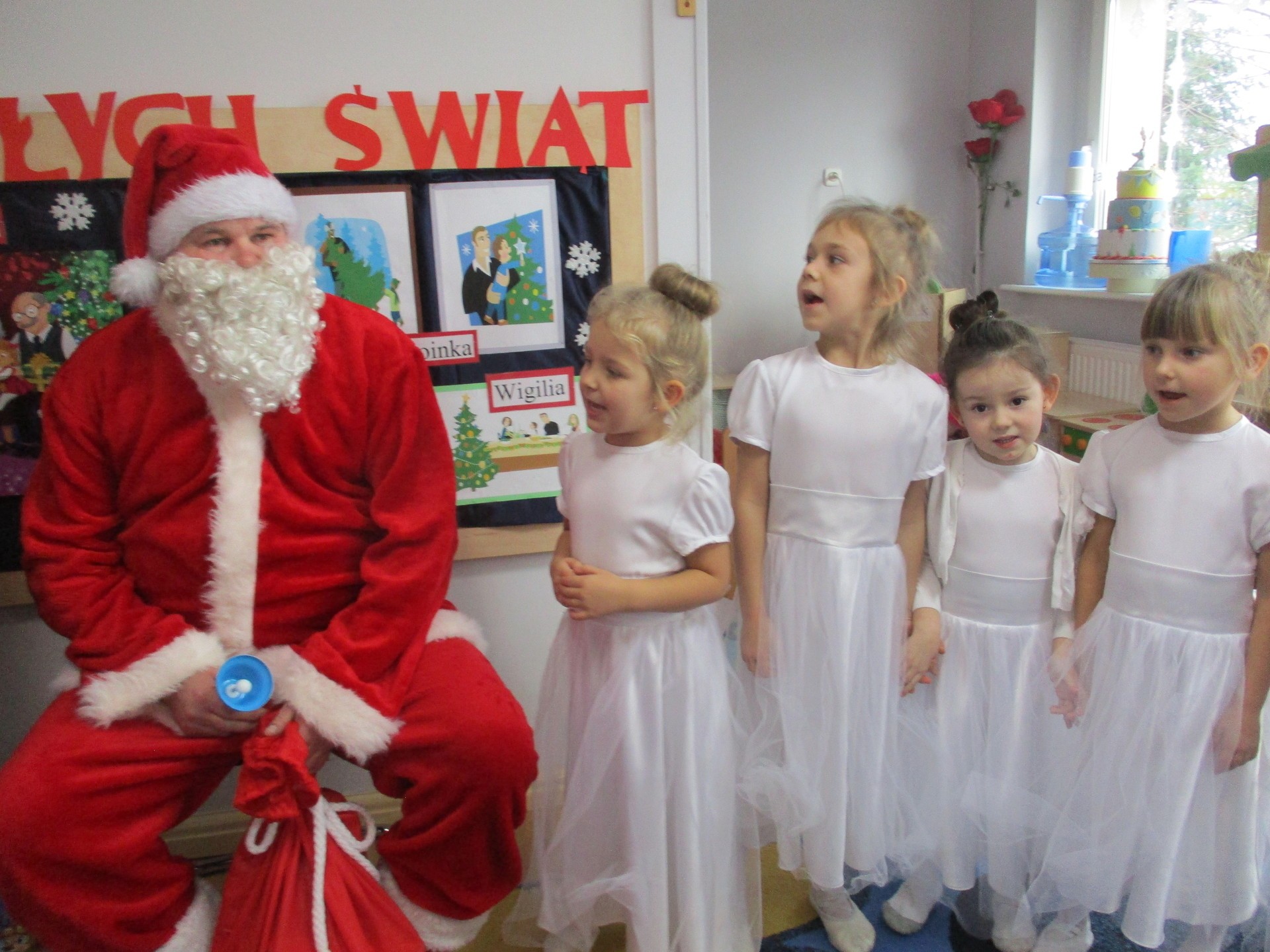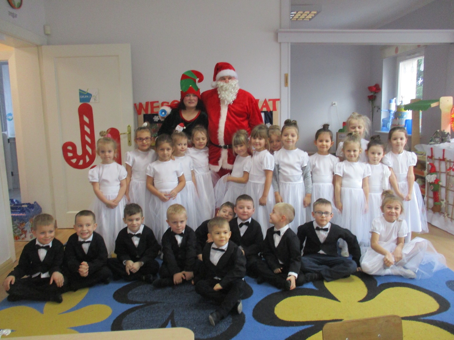 Wigilia Bożego Narodzenia to jeden z najpiękniejszych dni w roku, dlatego w naszej przedszkolnej rodzinie przeżywamy go bardzo uroczyście. Nasza przedszkolna wigilia odbyła się w piątek. Na początku dzieci zjadły wspólny posiłek. W dalszej części uroczystości dzieci odwiedził Mikołaj wraz z Elfem.Dzieliliśmy się również opłatkiem życząc sobie nawzajem wszelkiej pomyślności i Wesołych Świąt. Nasze spotkanie zakończyło się wspólnym kolędowaniem przy wigilijnym stole.