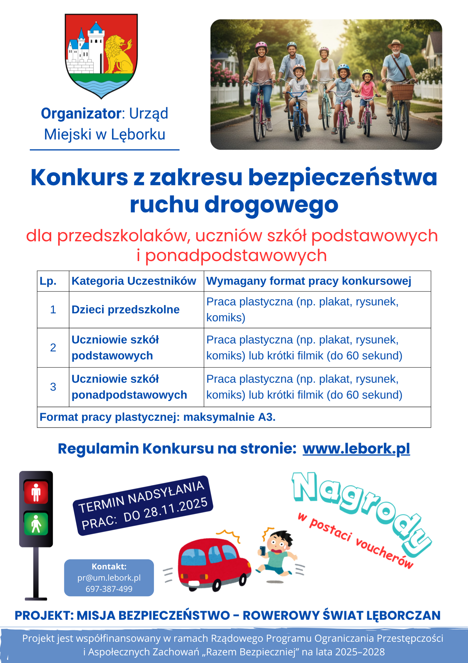 Serdecznie zapraszamy naszych przedszkolaków do konkursu plastycznego " Misja Bezpieczeństwo - Rowerowy Świat Lęborczan. Organizatorem konkursu jest Urząd Miejski w Lęborku. Wszelkie informacje znajdują się w załącznikach poniżej oraz u wychowawców grup.