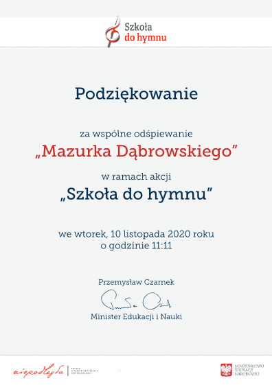 w imieniu Ministra Edukacji i Nauki Przemysława Czarnka serdecznie dziękuję za udział w akcji „Szkoła do hymnu”. Cieszę się, że tak wielu uczniów i nauczycieli uczciło w ten sposób Narodowe Święto Niepodległości.