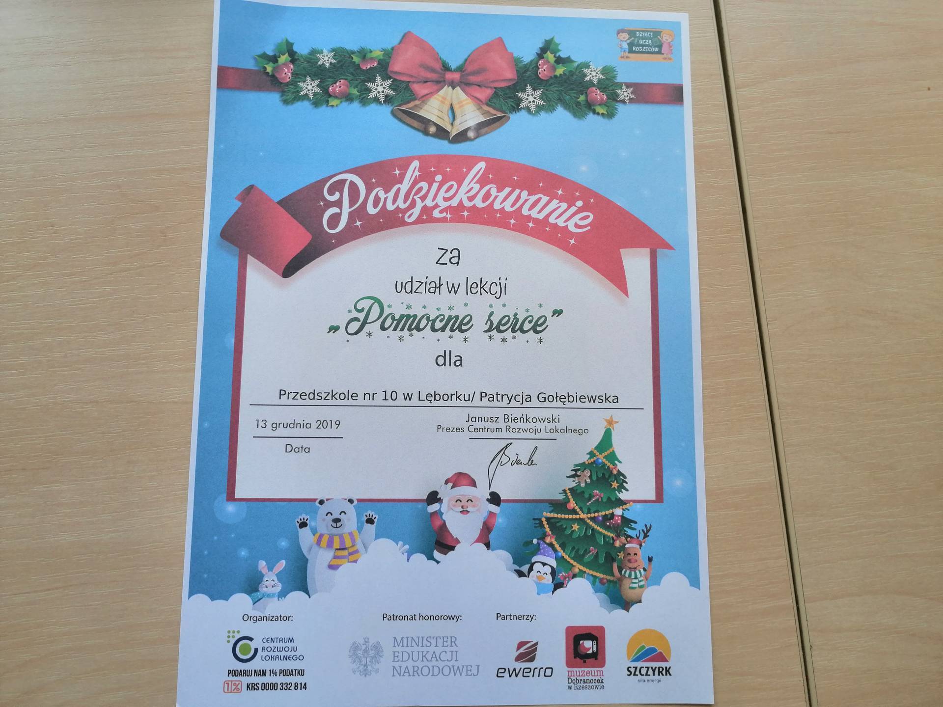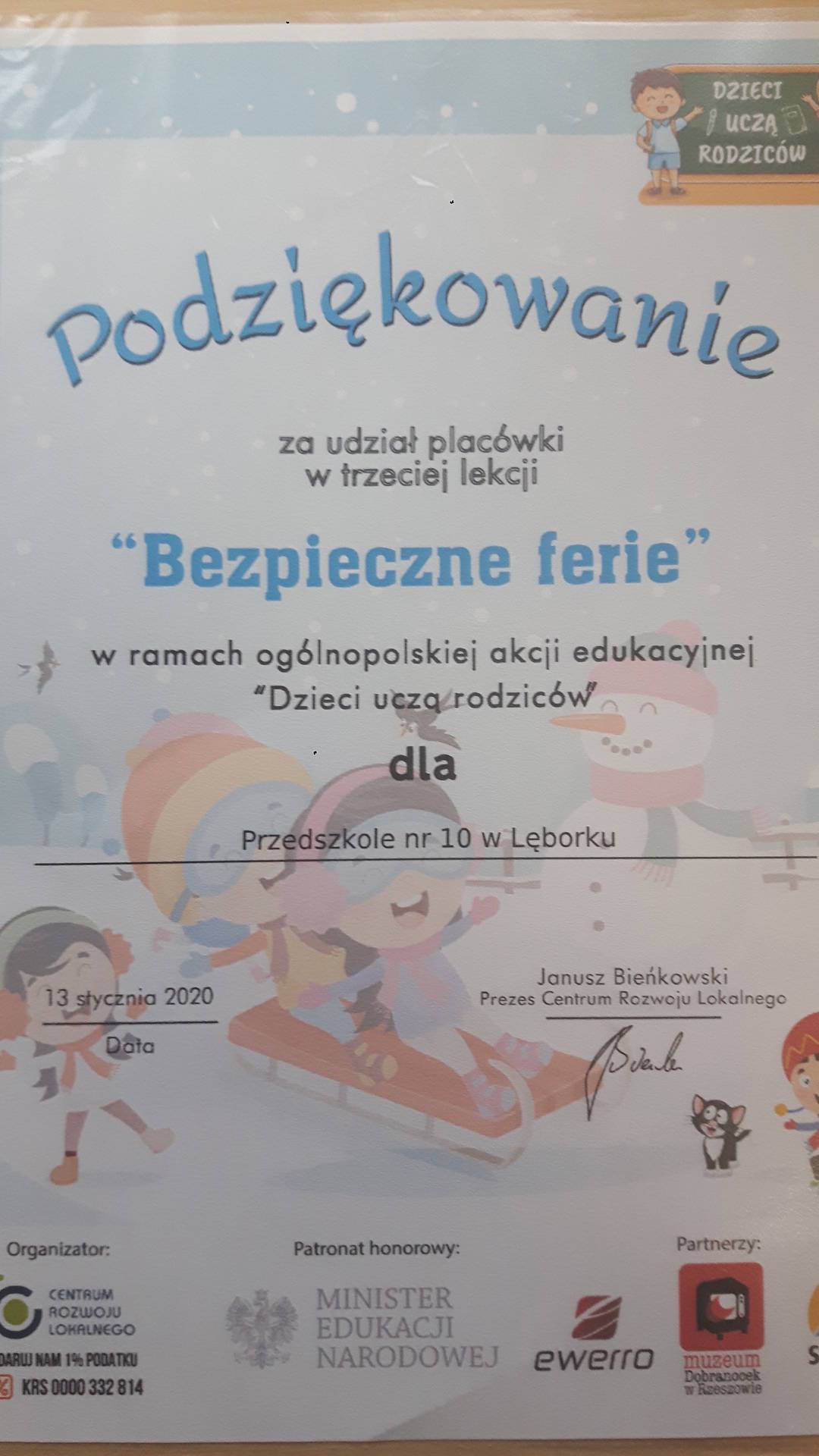 Podziękowanie za udział w kolejnych lekcjach Dzieci uczą rodzoców