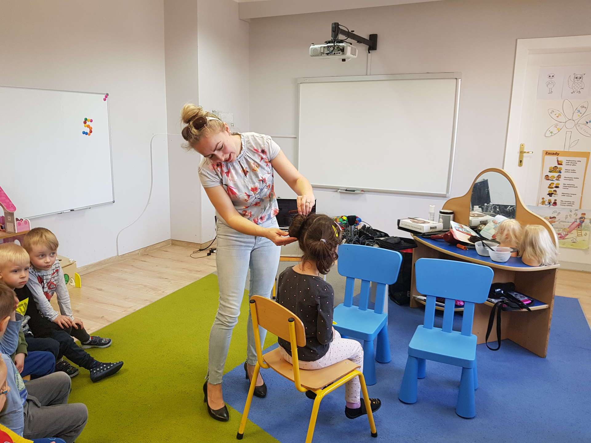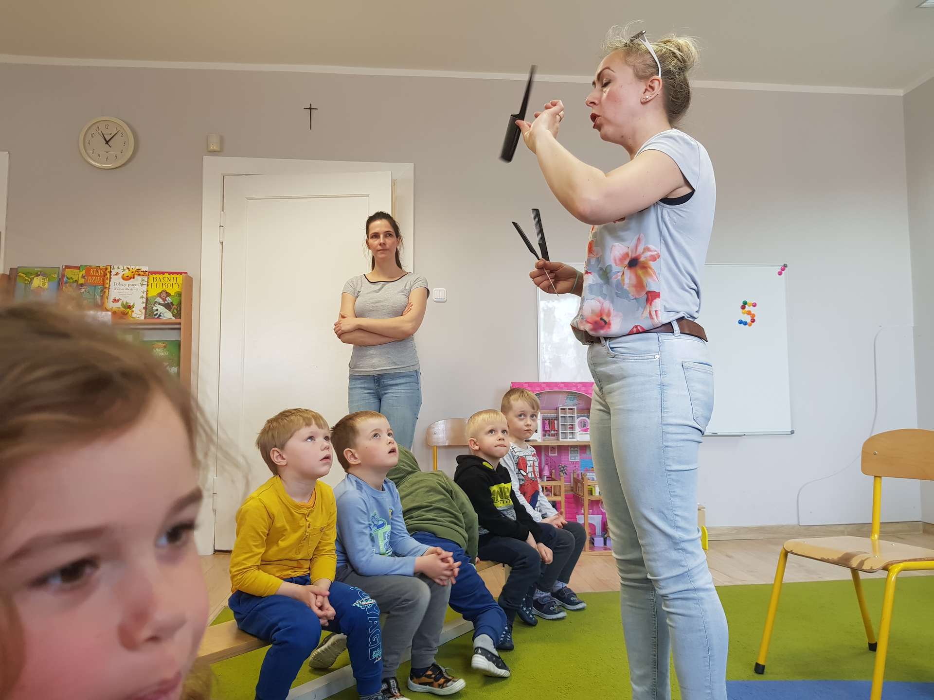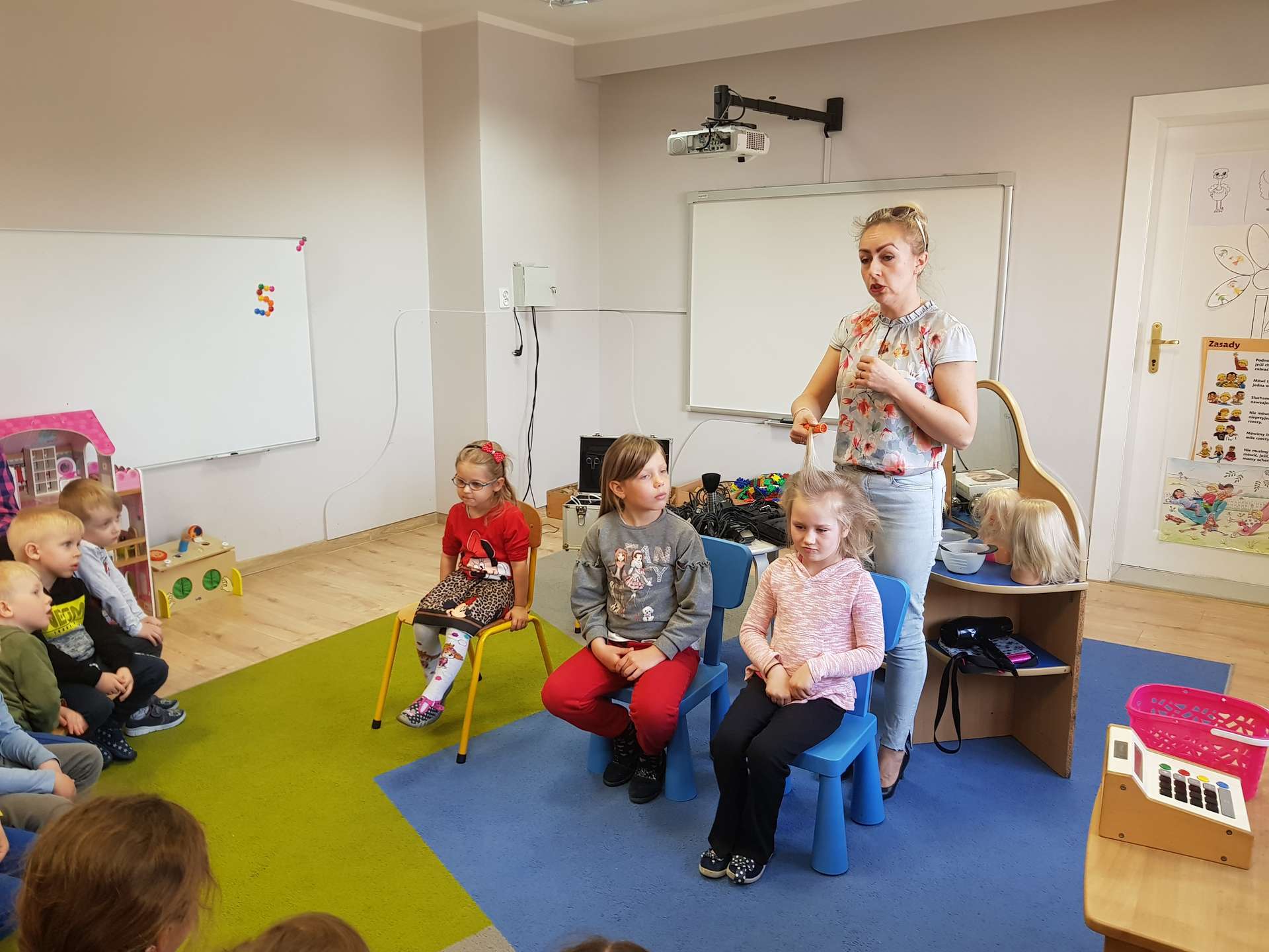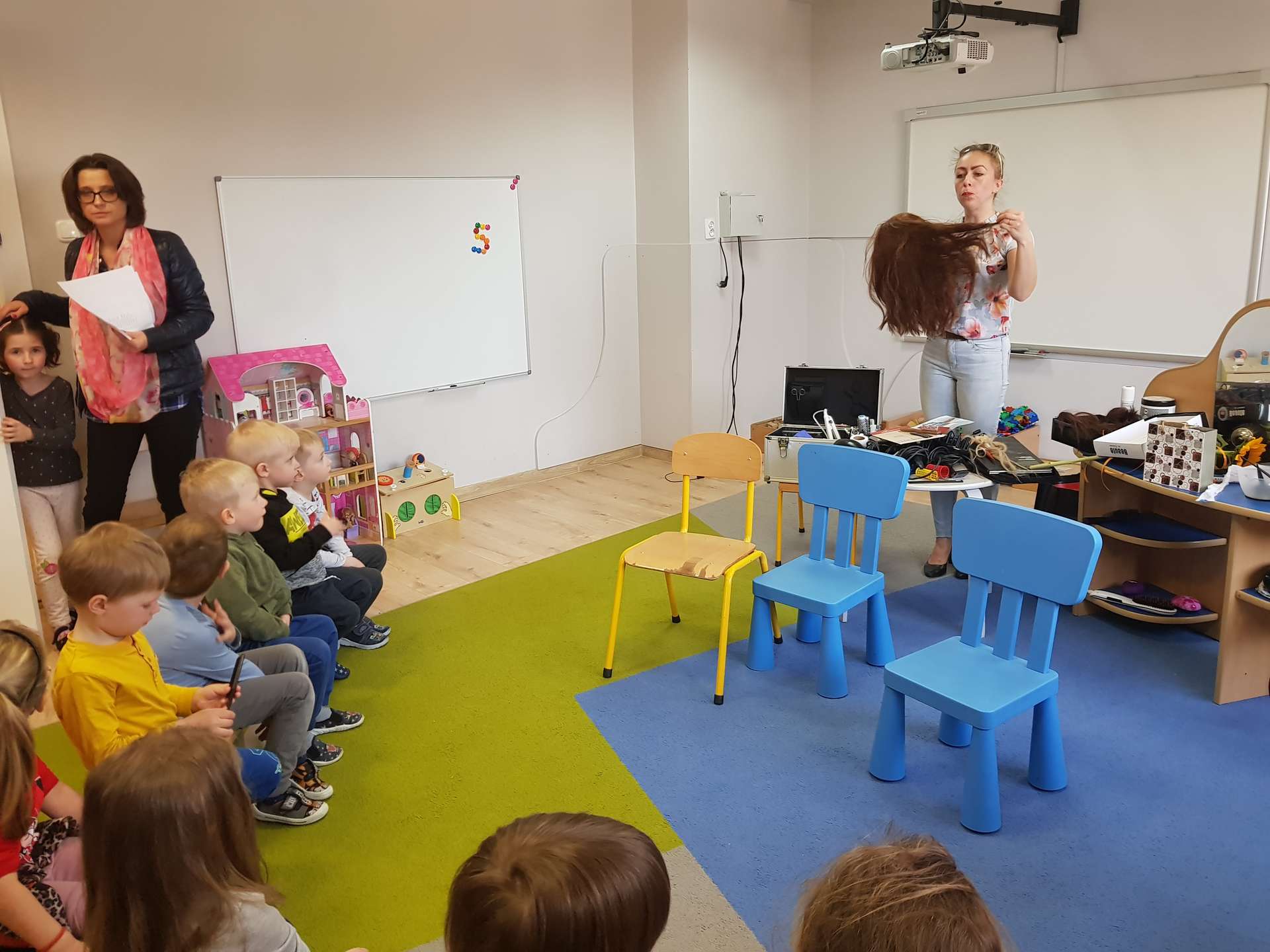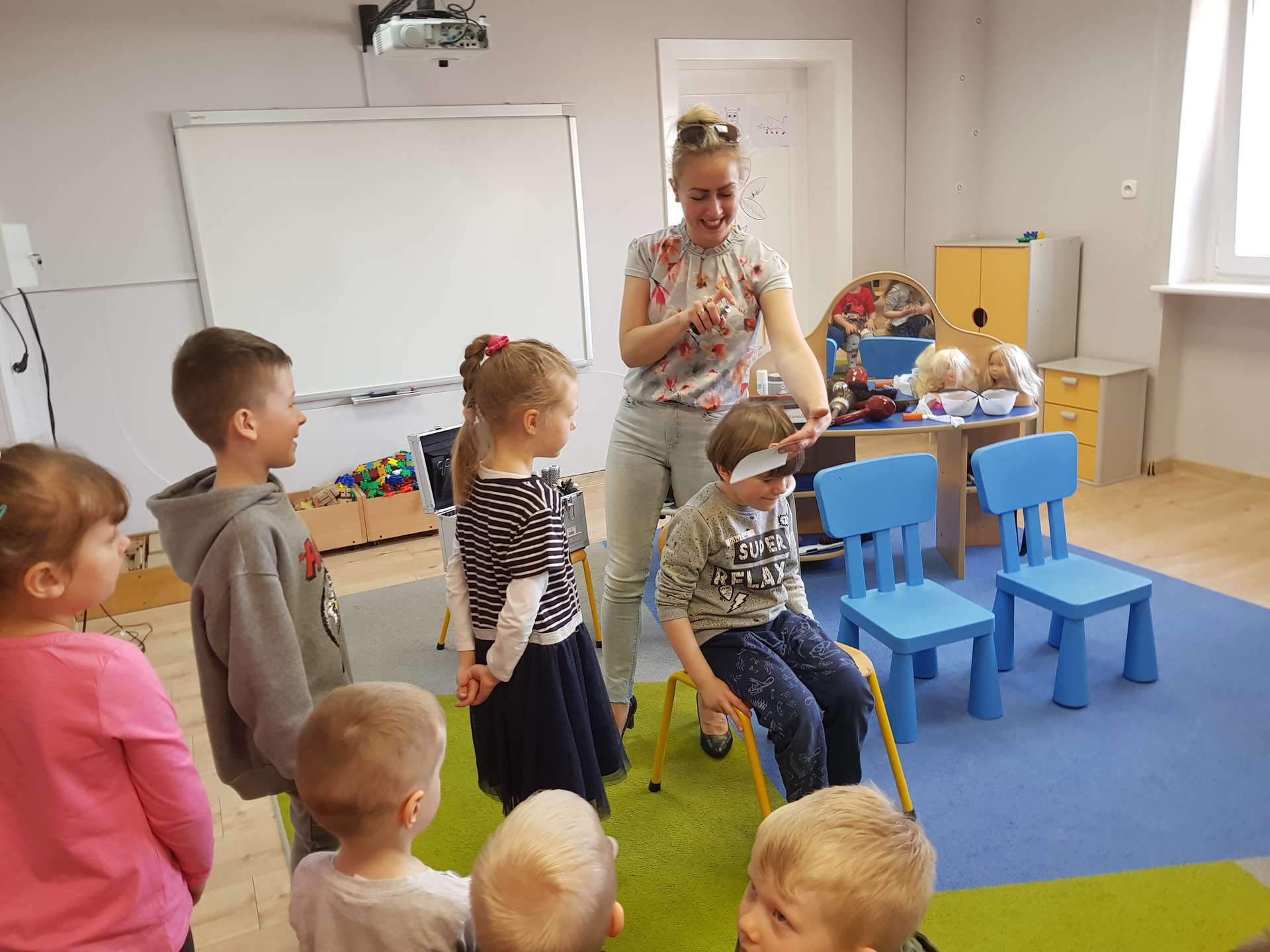 Pani Ania przedstawiła najważniejsze informacje dotyczące charakteru pracy fryzjerki. Dzieci dowiedziały się, jak należy dbać o włosy i skórę głowy.