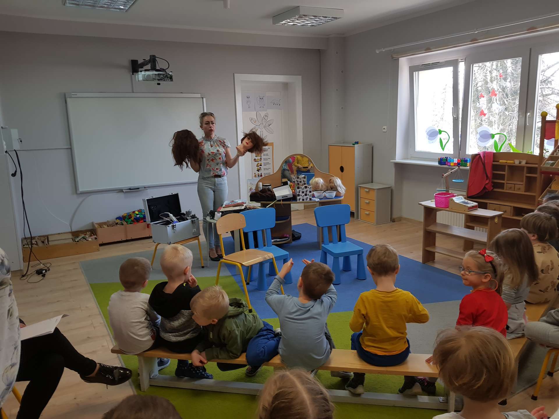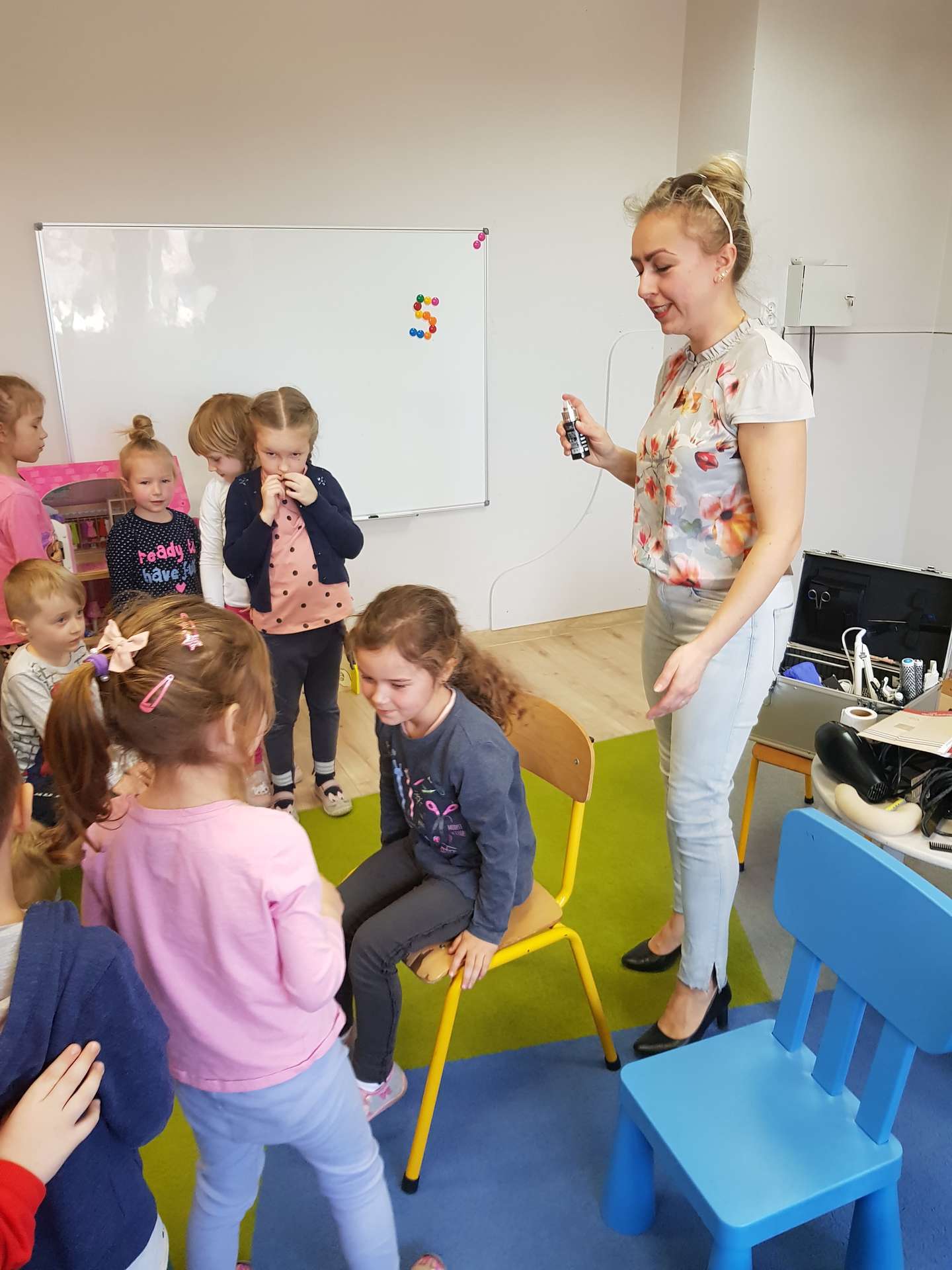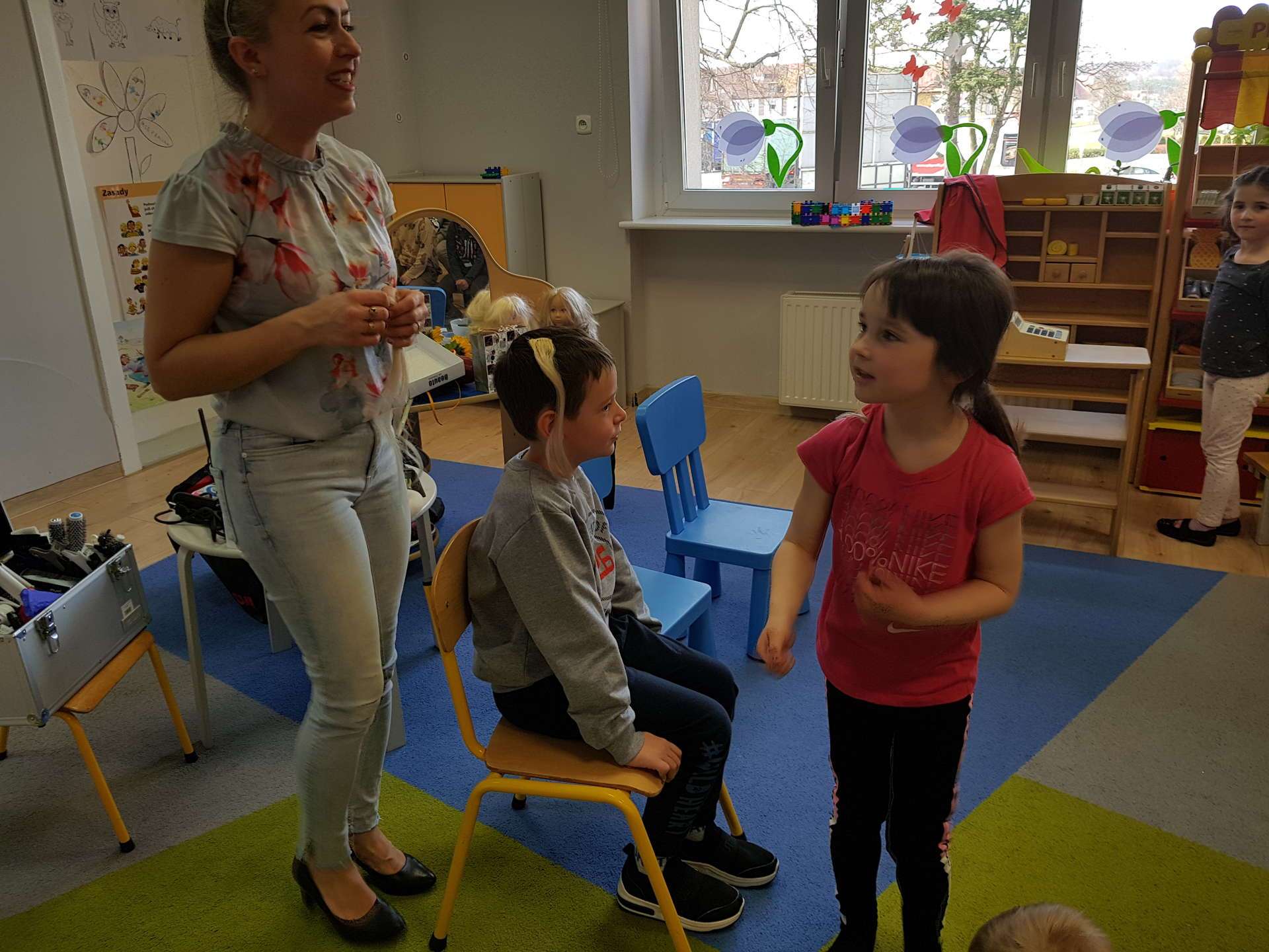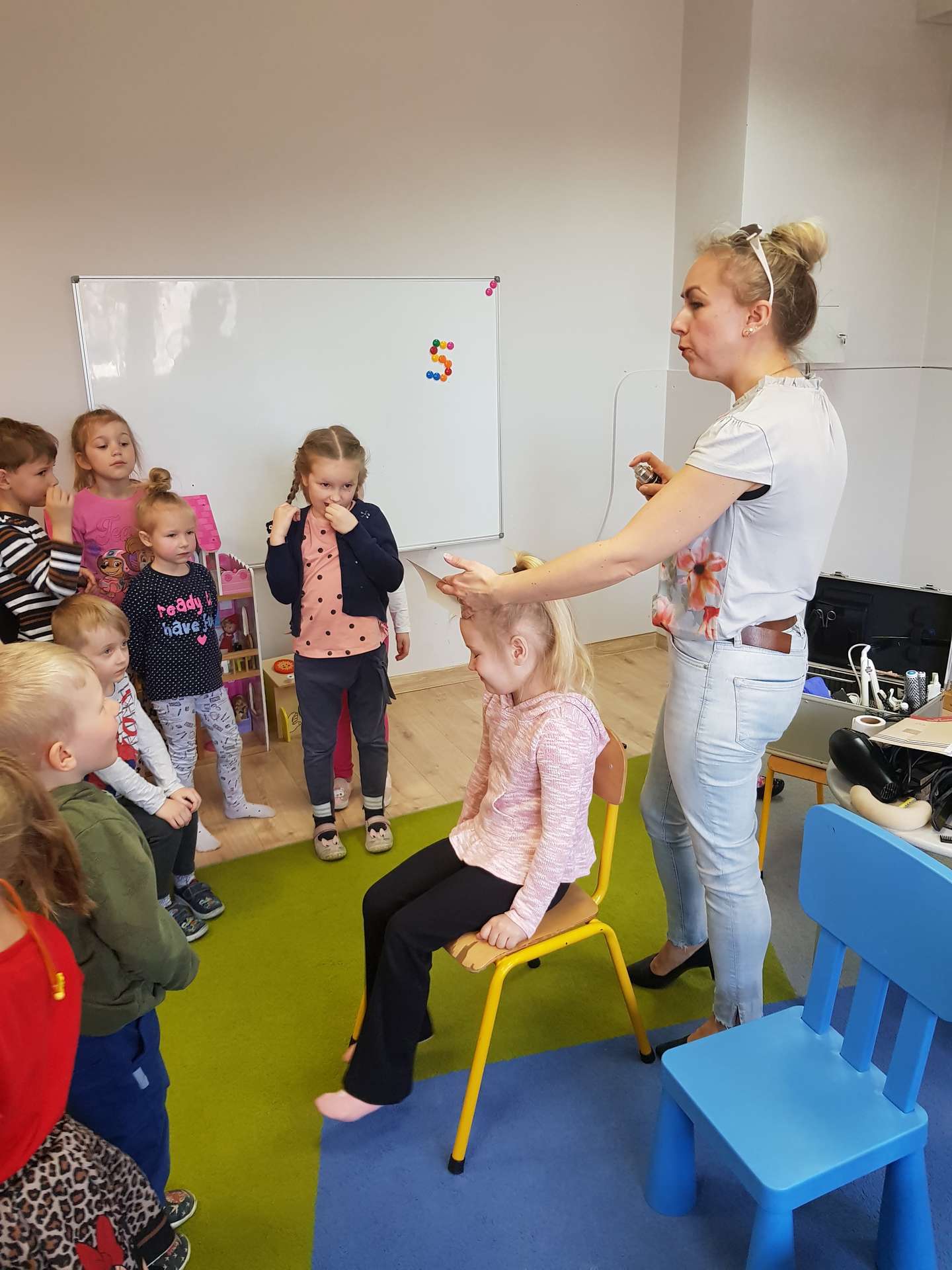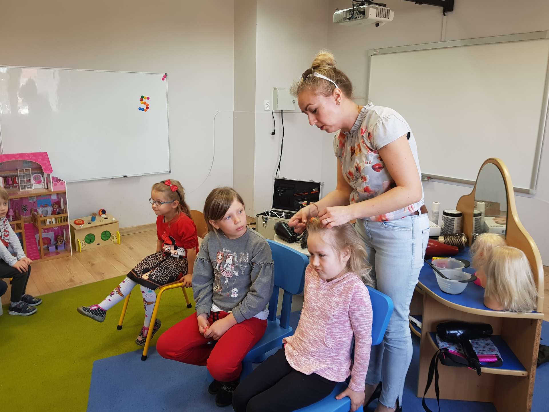 Pani Ania przedstawiła najważniejsze informacje dotyczące charakteru pracy fryzjerki. Dzieci dowiedziały się, jak należy dbać o włosy i skórę głowy.