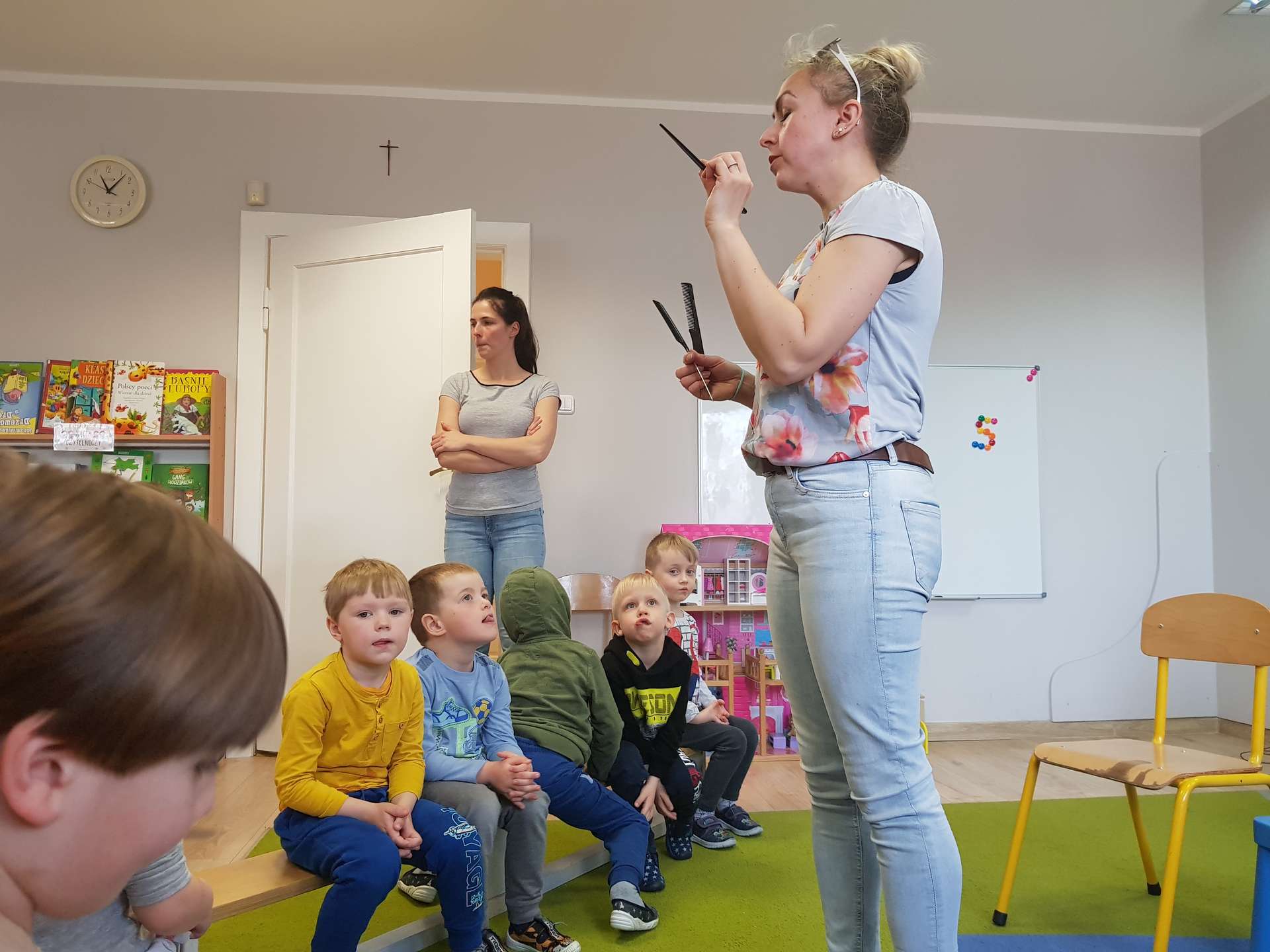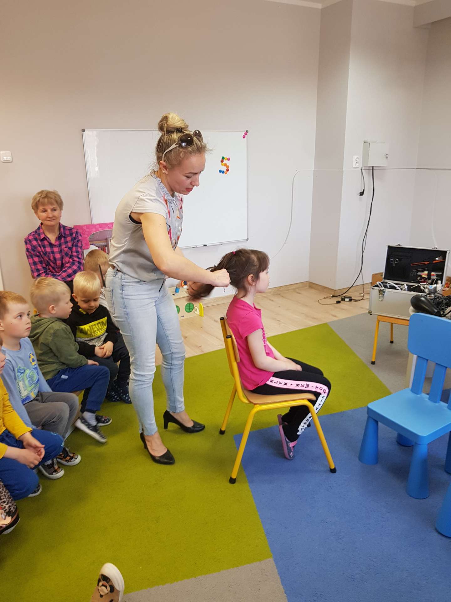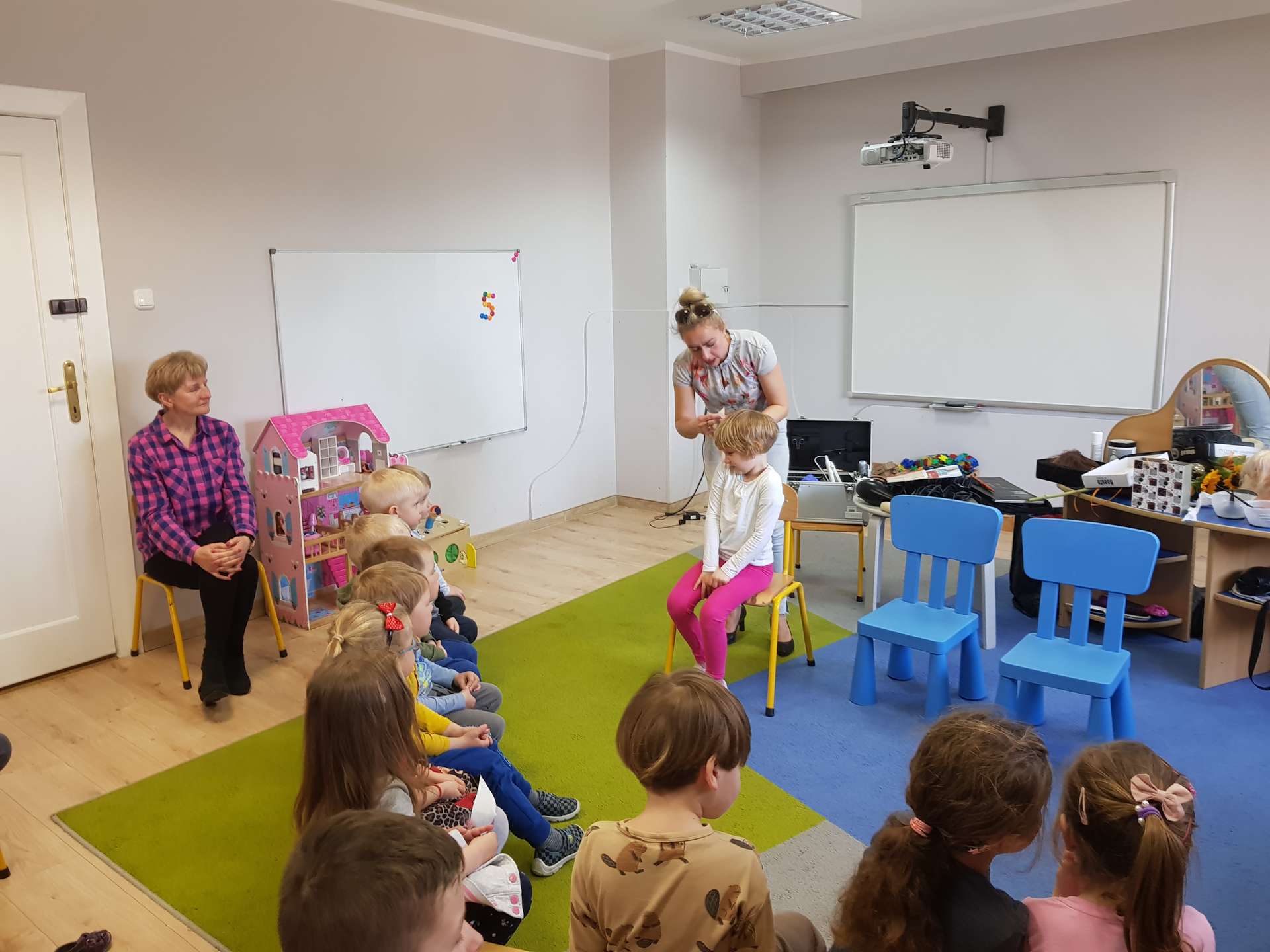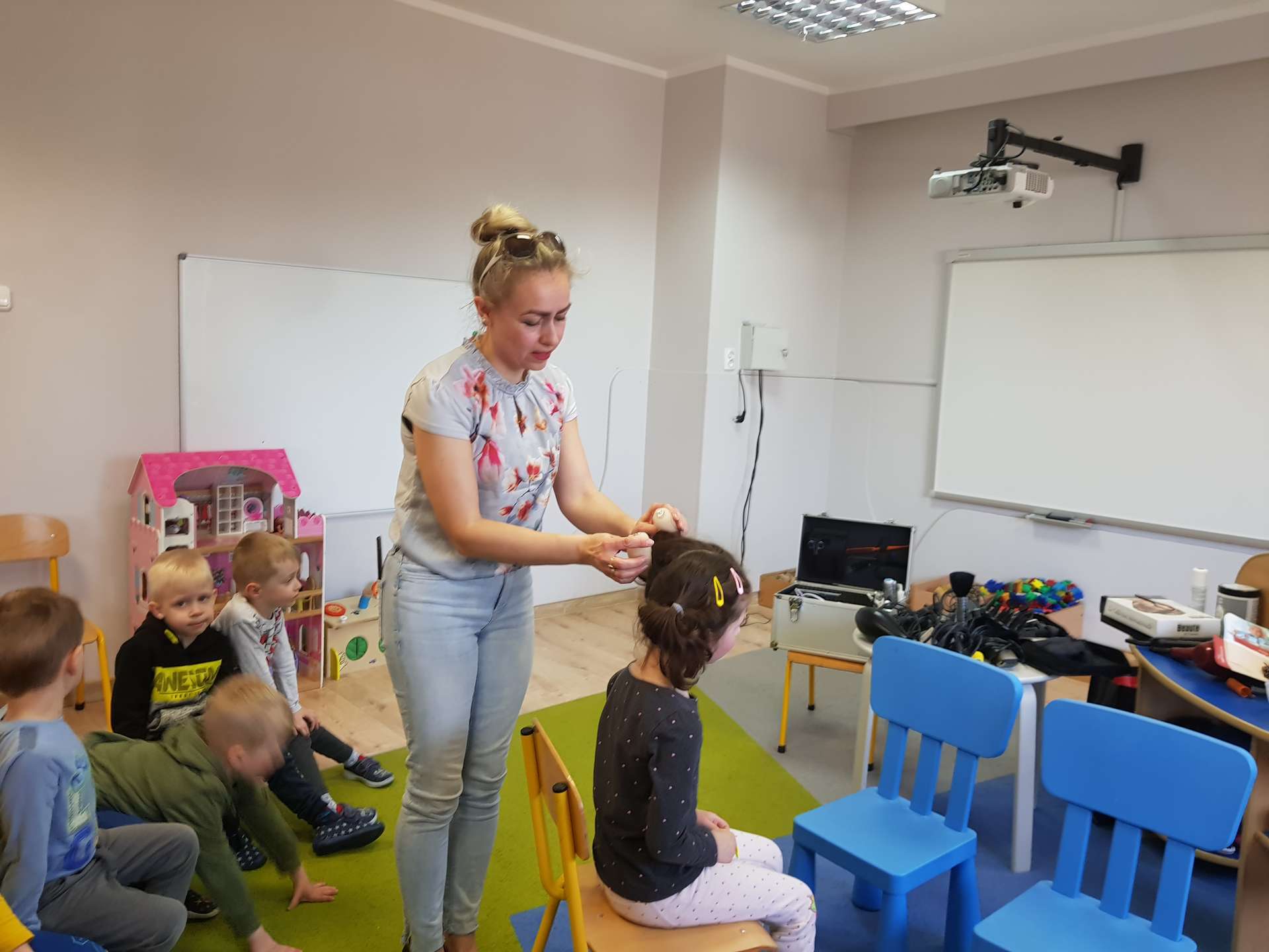Pani Ania przedstawiła najważniejsze informacje dotyczące charakteru pracy fryzjerki. Dzieci dowiedziały się, jak należy dbać o włosy i skórę głowy.