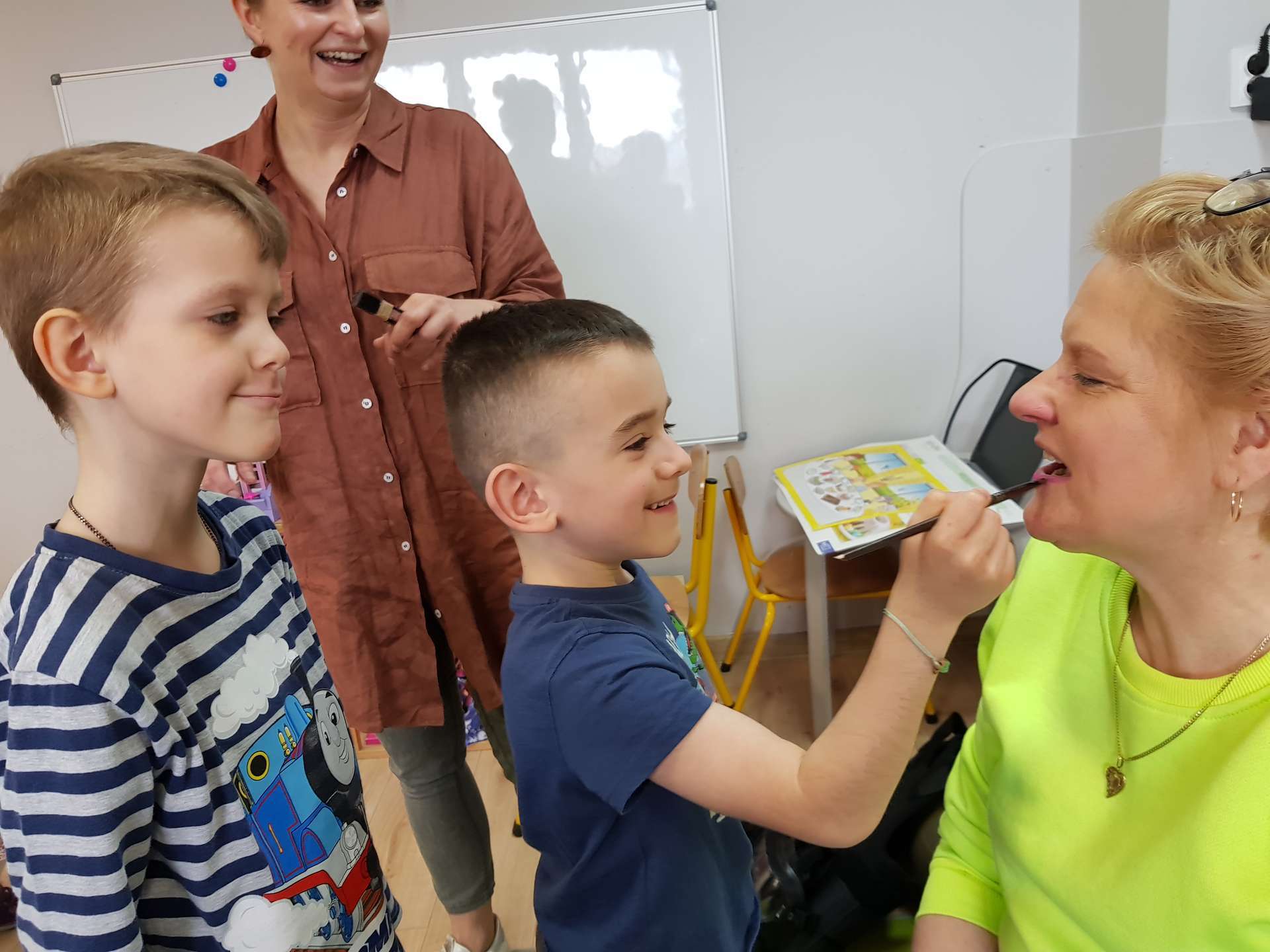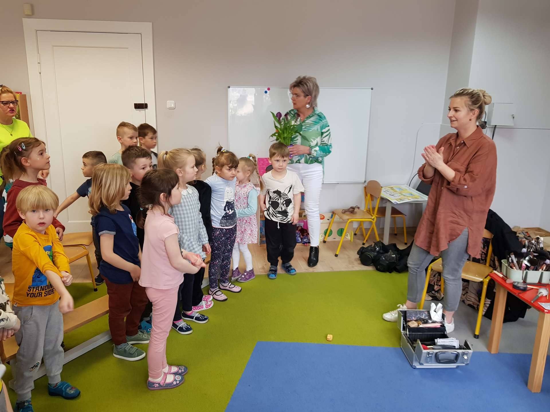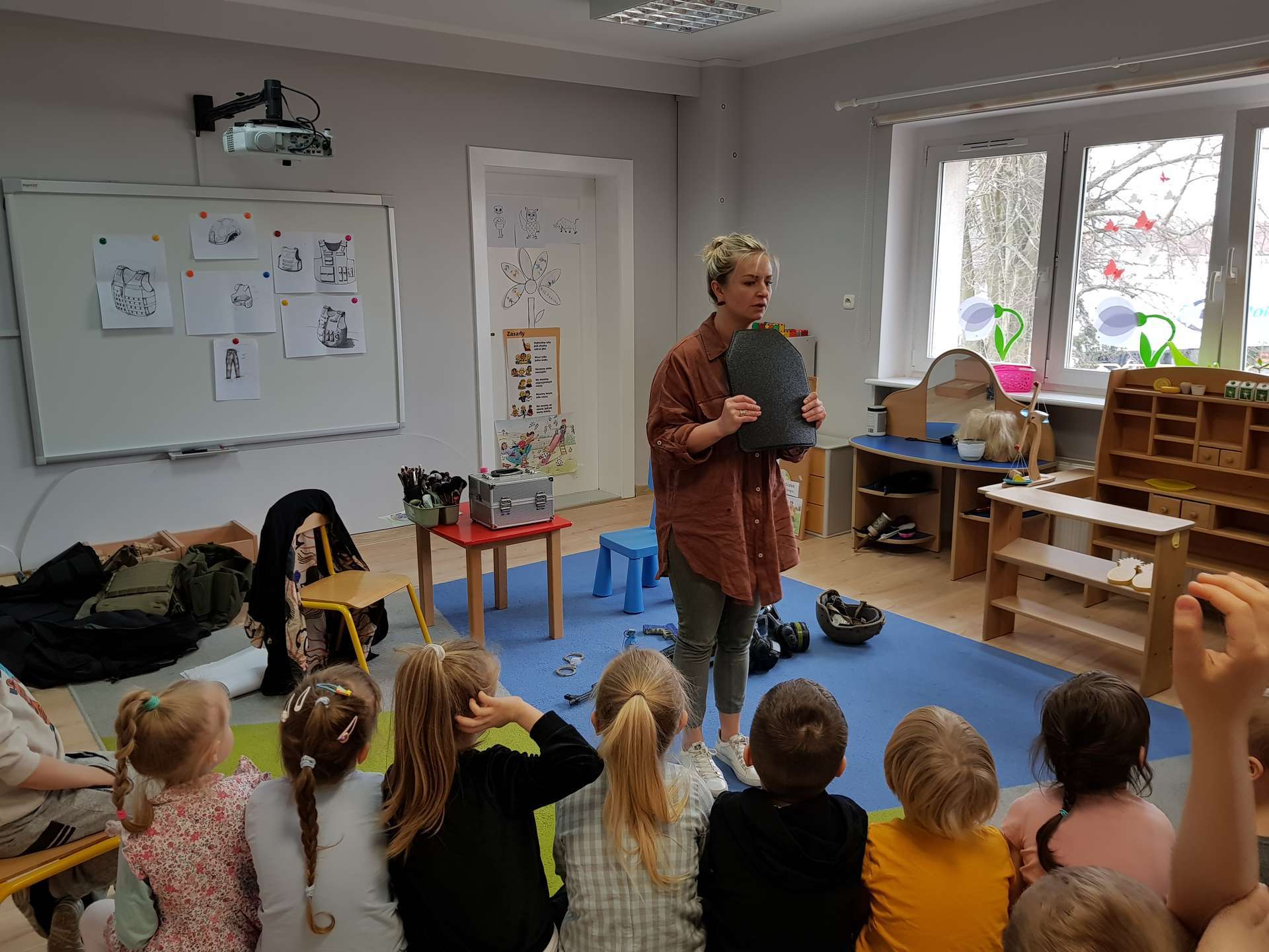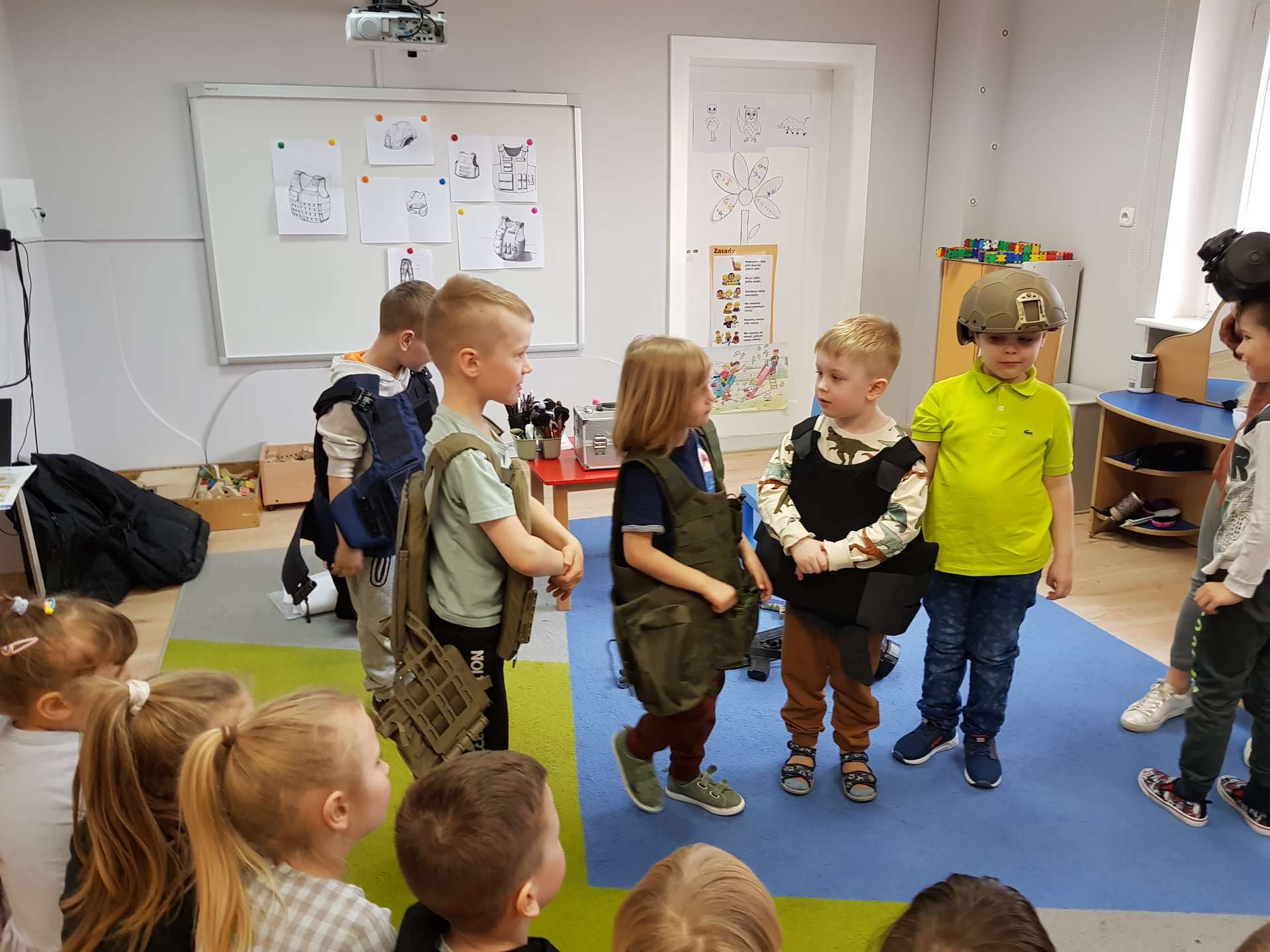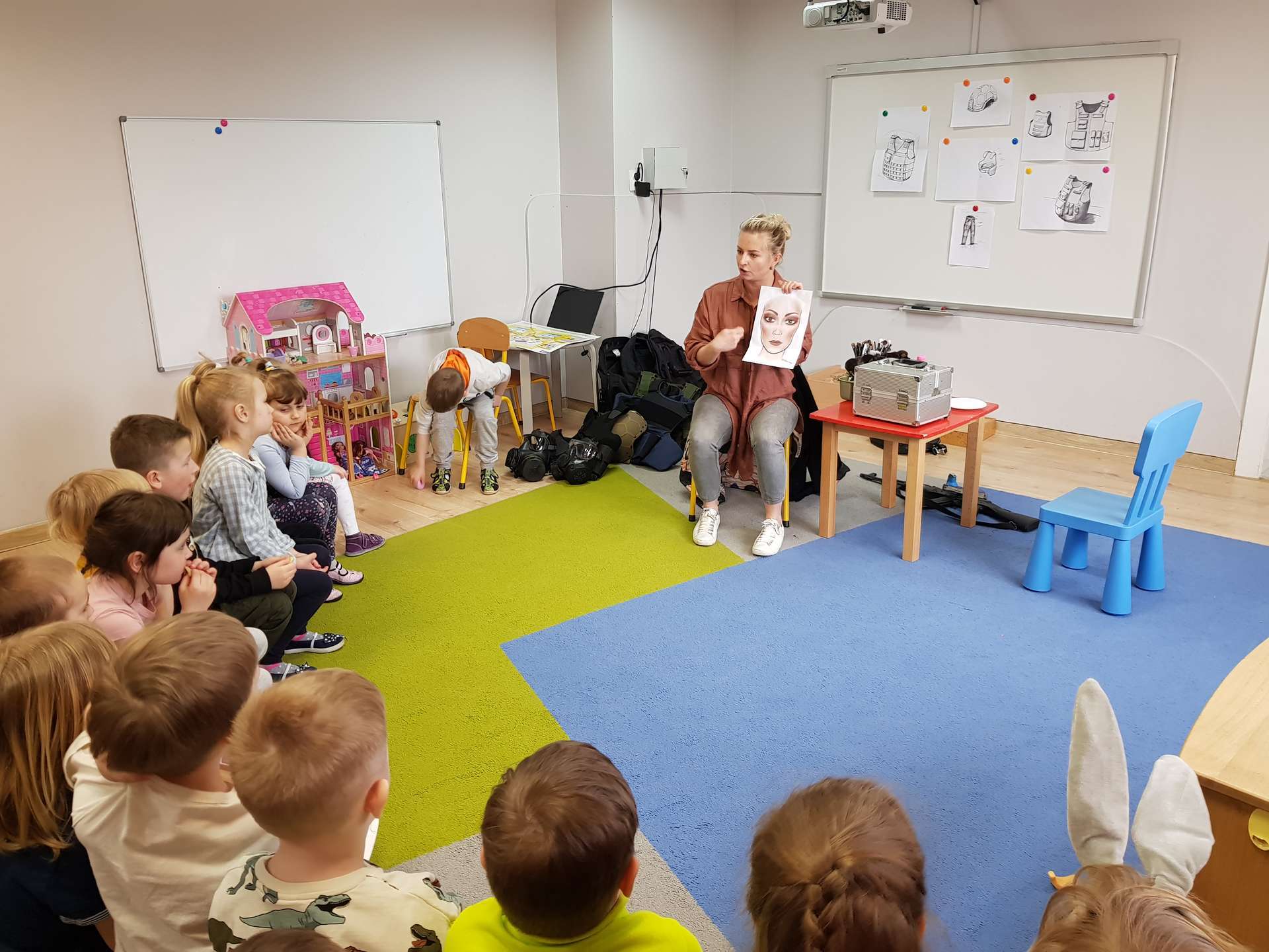 Dzisiaj gościliśmy p. Katarzynę Koszałkę - mamę Rysia z grupy III. Pani Kasia opowiedziała dzieciom o swoich dwóch zawodach - projektantki odzieży militarnej oraz makijażystki. Chłopcom bardzo podobały się opowieści o tym, jak powstają kamizelki, spodnie, hełmy i inne rzeczy, które są w wyposażeniu żołnierza. Okazuje się, że zaprojektowanie takiej odzieży to bardzo trudny i długi proces. Najpierw trzeba mieć pomysł na projekt, później go naszkicować, wybrać materiał z którego będzie wykonany i dopiero wtedy następuje produkcja. Wielką atrakcją było przymierzanie przez dzieci odzieży militarnej. Dziewczynki z kolei zachwycone były pokazem makijażu, przyborami, różnorodnością kolorów, techniką malowania. A malowanie swoich Pań okazało się "strzałem w dziesiątkę". To było niesamowite spotkanie !!!