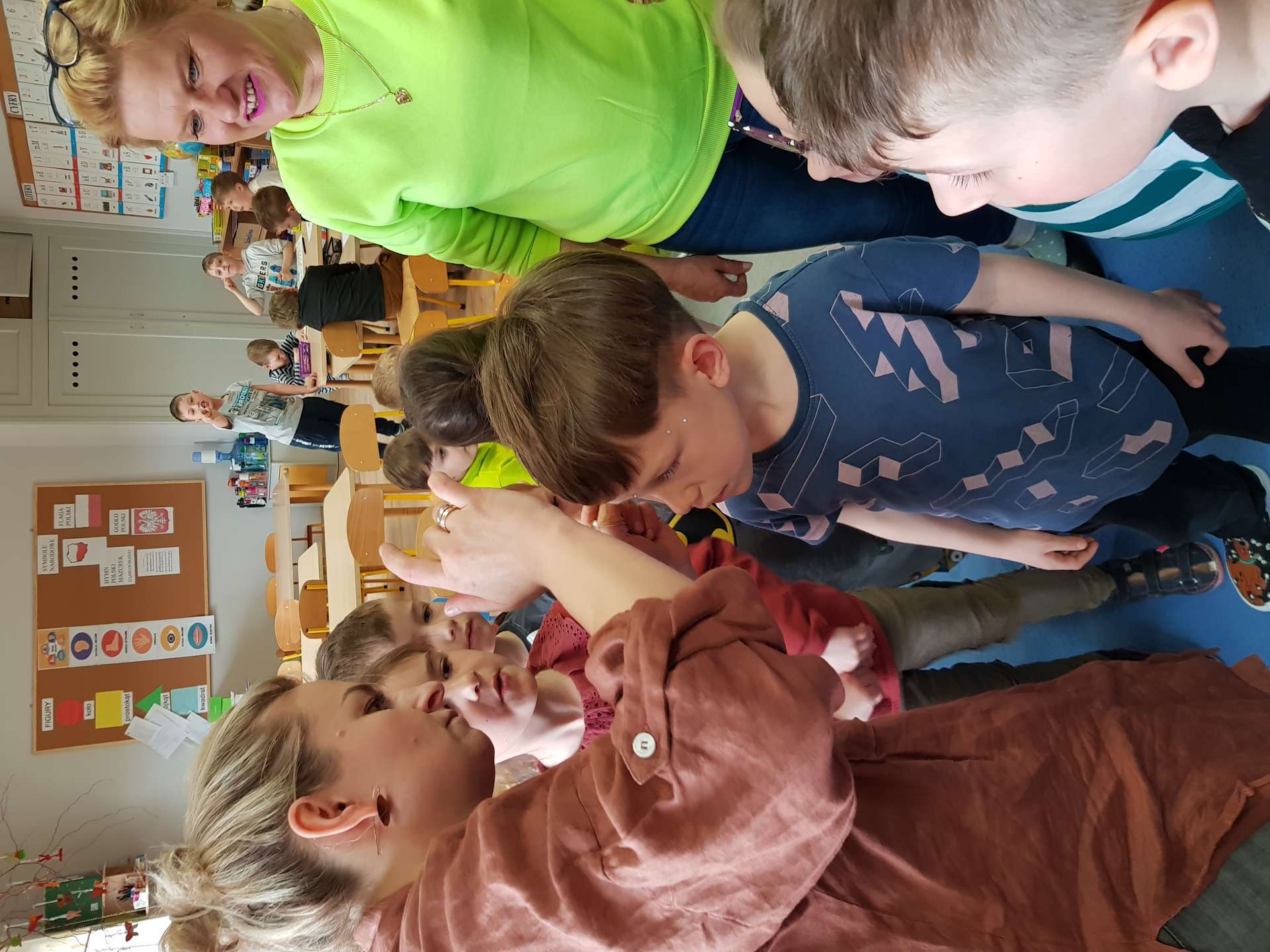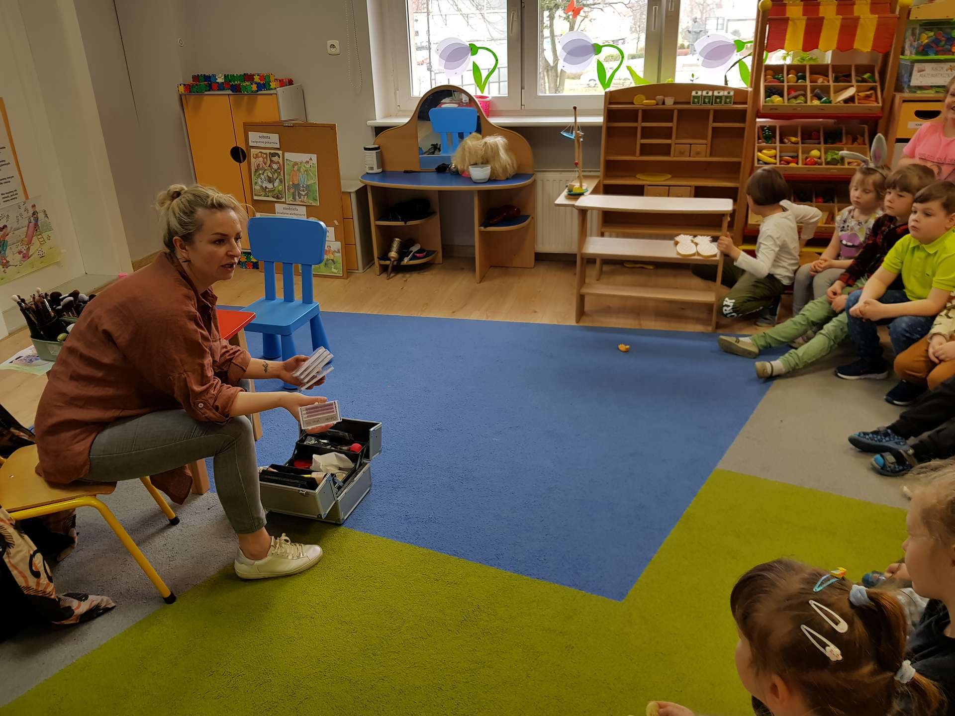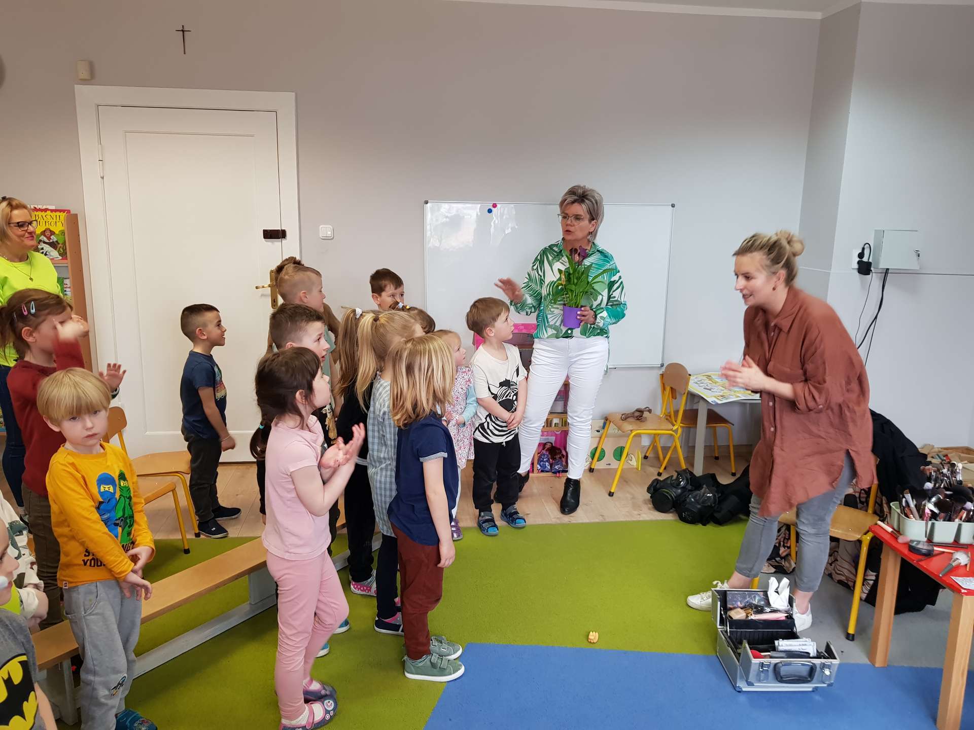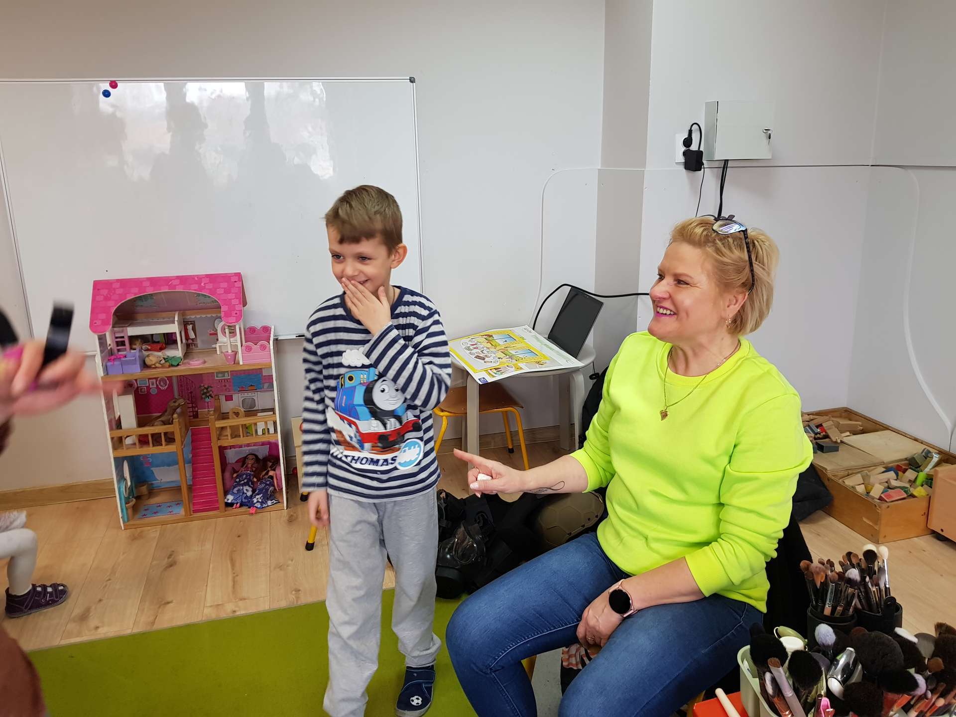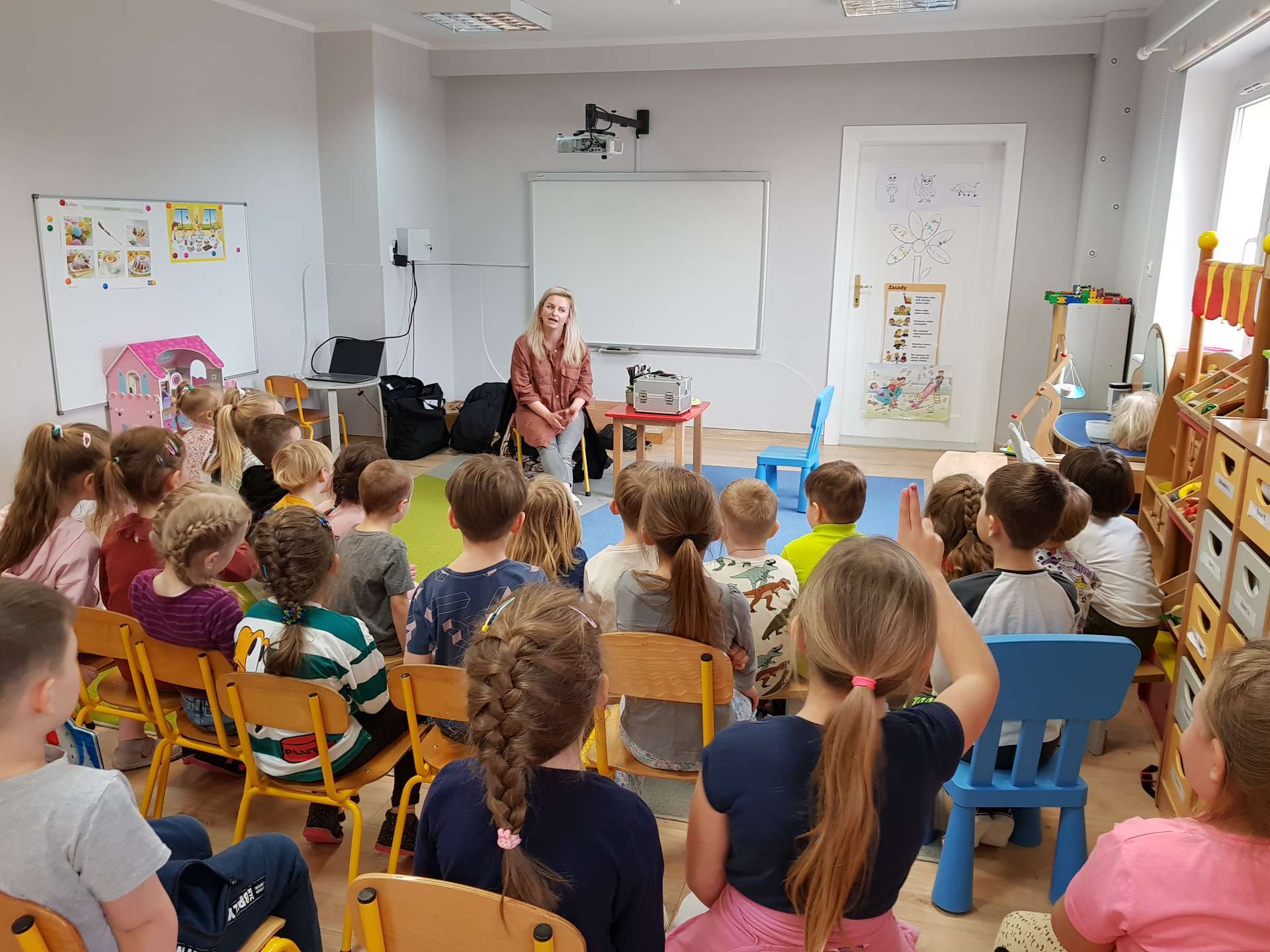 Dzisiaj gościliśmy p. Katarzynę Koszałkę - mamę Rysia z grupy III. Pani Kasia opowiedziała dzieciom o swoich dwóch zawodach - projektantki odzieży militarnej oraz makijażystki. Chłopcom bardzo podobały się opowieści o tym, jak powstają kamizelki, spodnie, hełmy i inne rzeczy, które są w wyposażeniu żołnierza. Okazuje się, że zaprojektowanie takiej odzieży to bardzo trudny i długi proces. Najpierw trzeba mieć pomysł na projekt, później go naszkicować, wybrać materiał z którego będzie wykonany i dopiero wtedy następuje produkcja. Wielką atrakcją było przymierzanie przez dzieci odzieży militarnej. Dziewczynki z kolei zachwycone były pokazem makijażu, przyborami, różnorodnością kolorów, techniką malowania. A malowanie swoich Pań okazało się "strzałem w dziesiątkę". To było niesamowite spotkanie !!!