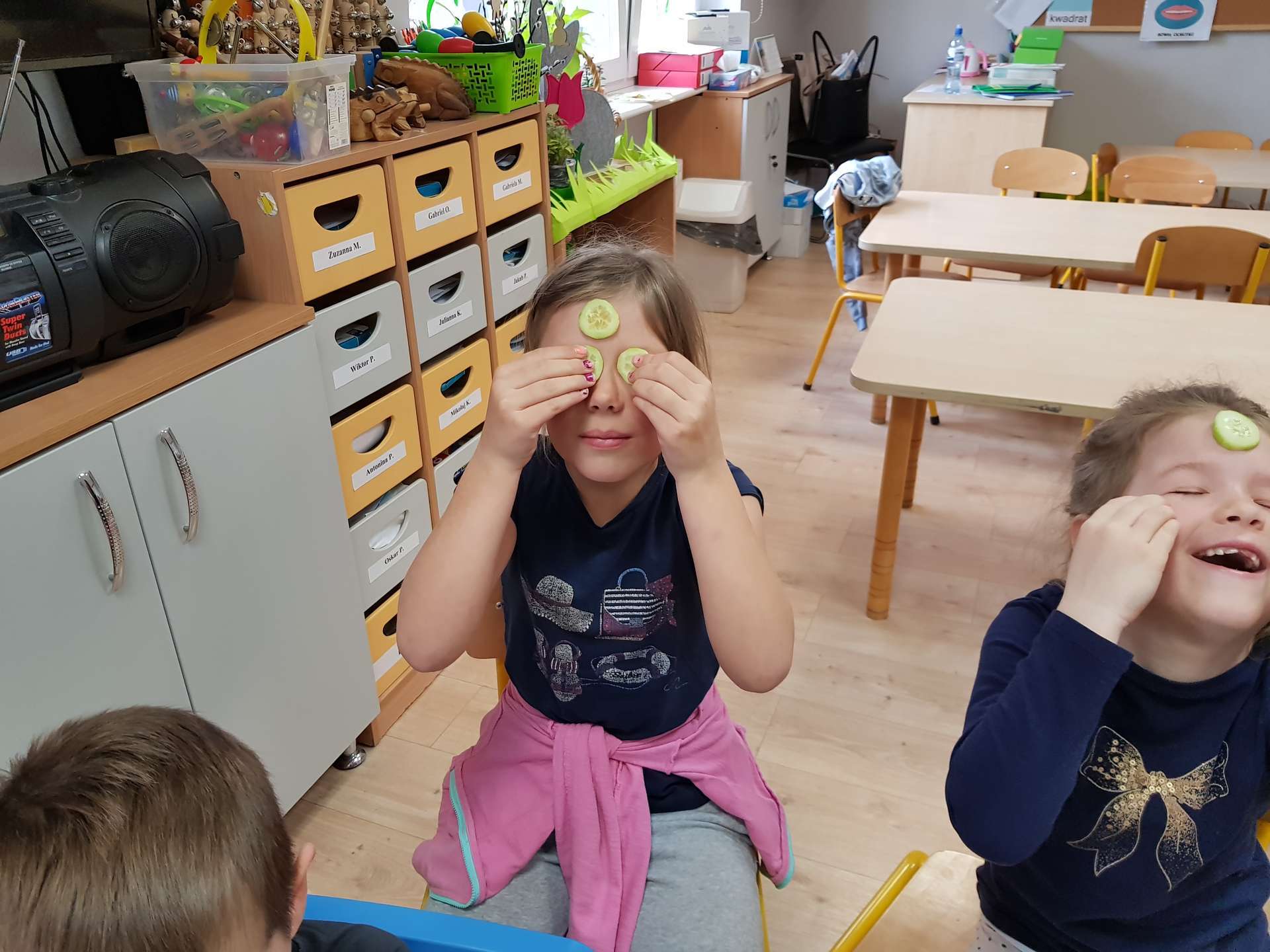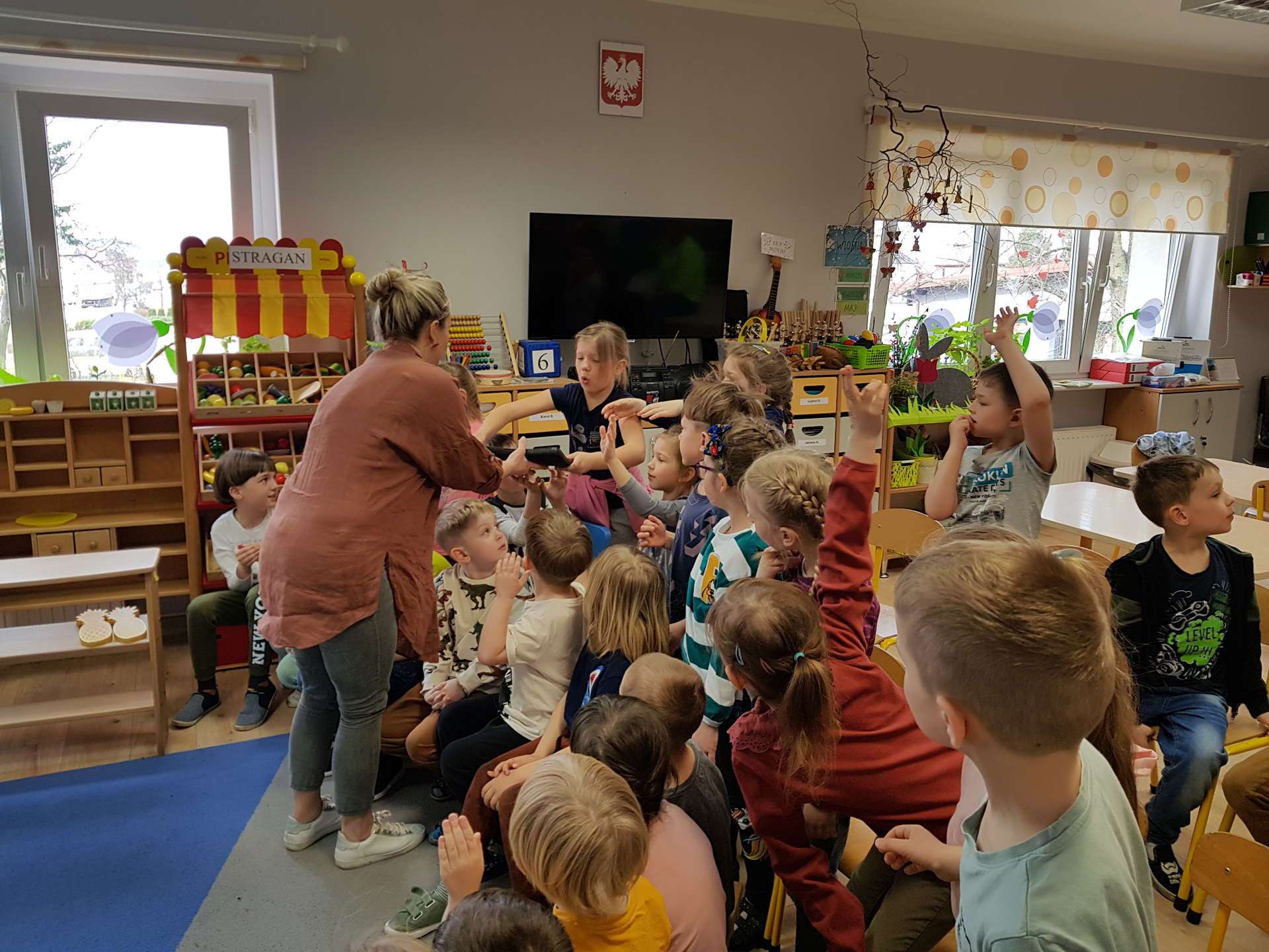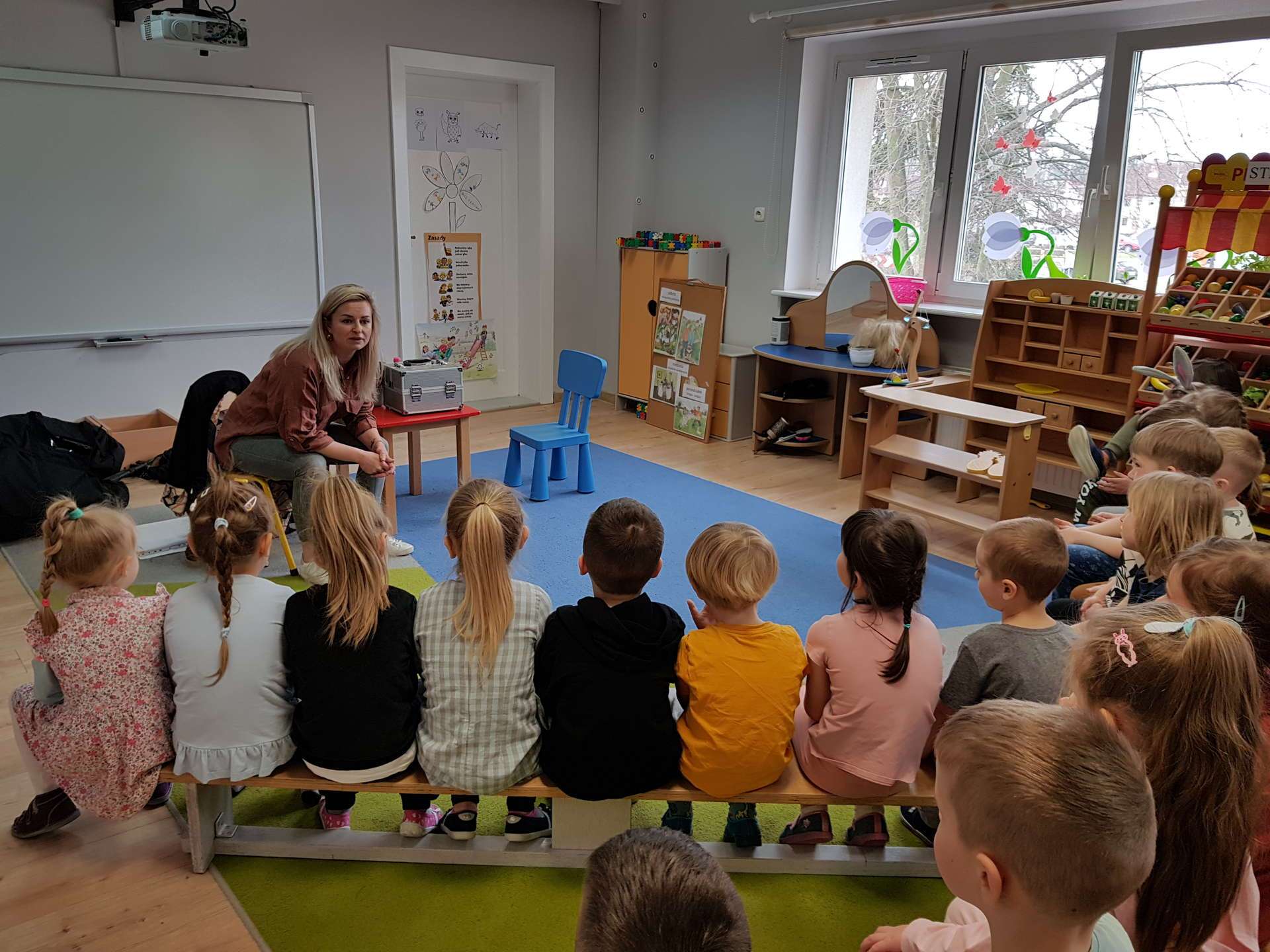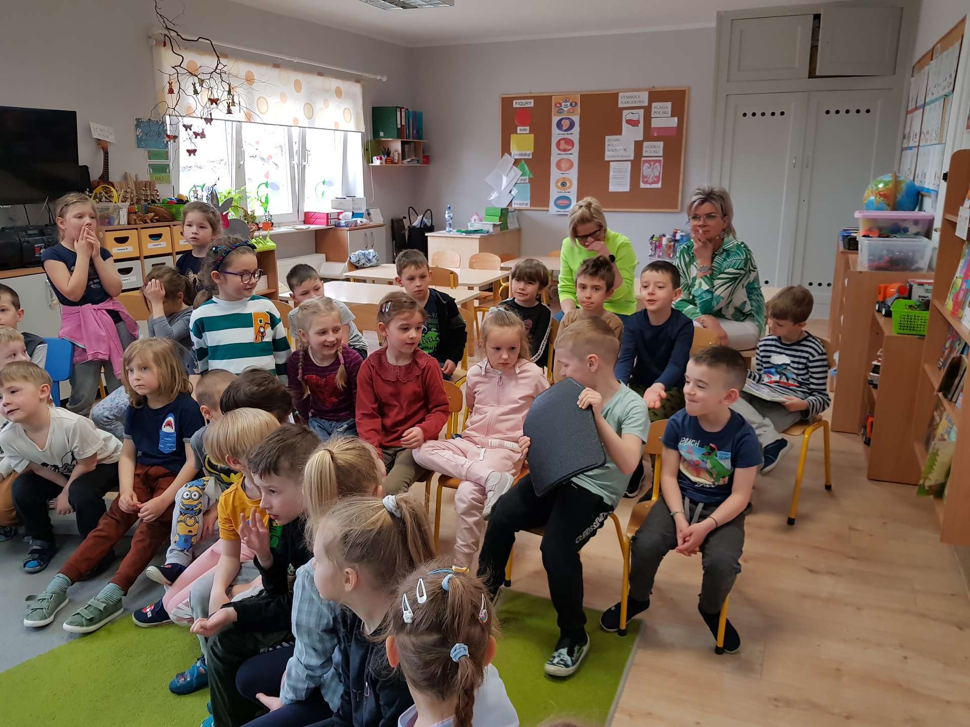 Dzisiaj gościliśmy p. Katarzynę Koszałkę - mamę Rysia z grupy III. Pani Kasia opowiedziała dzieciom o swoich dwóch zawodach - projektantki odzieży militarnej oraz makijażystki. Chłopcom bardzo podobały się opowieści o tym, jak powstają kamizelki, spodnie, hełmy i inne rzeczy, które są w wyposażeniu żołnierza. Okazuje się, że zaprojektowanie takiej odzieży to bardzo trudny i długi proces. Najpierw trzeba mieć pomysł na projekt, później go naszkicować, wybrać materiał z którego będzie wykonany i dopiero wtedy następuje produkcja. Wielką atrakcją było przymierzanie przez dzieci odzieży militarnej. Dziewczynki z kolei zachwycone były pokazem makijażu, przyborami, różnorodnością kolorów, techniką malowania. A malowanie swoich Pań okazało się "strzałem w dziesiątkę". To było niesamowite spotkanie !!!