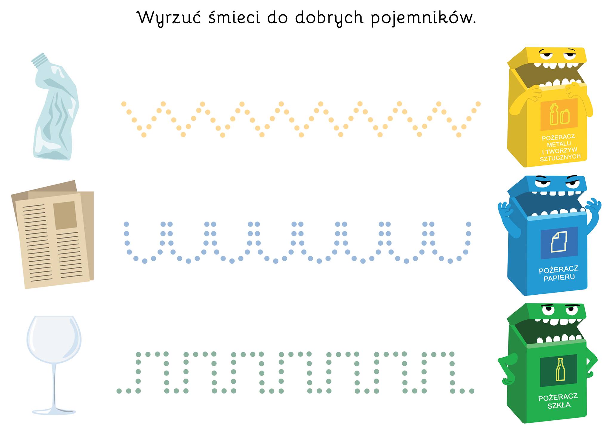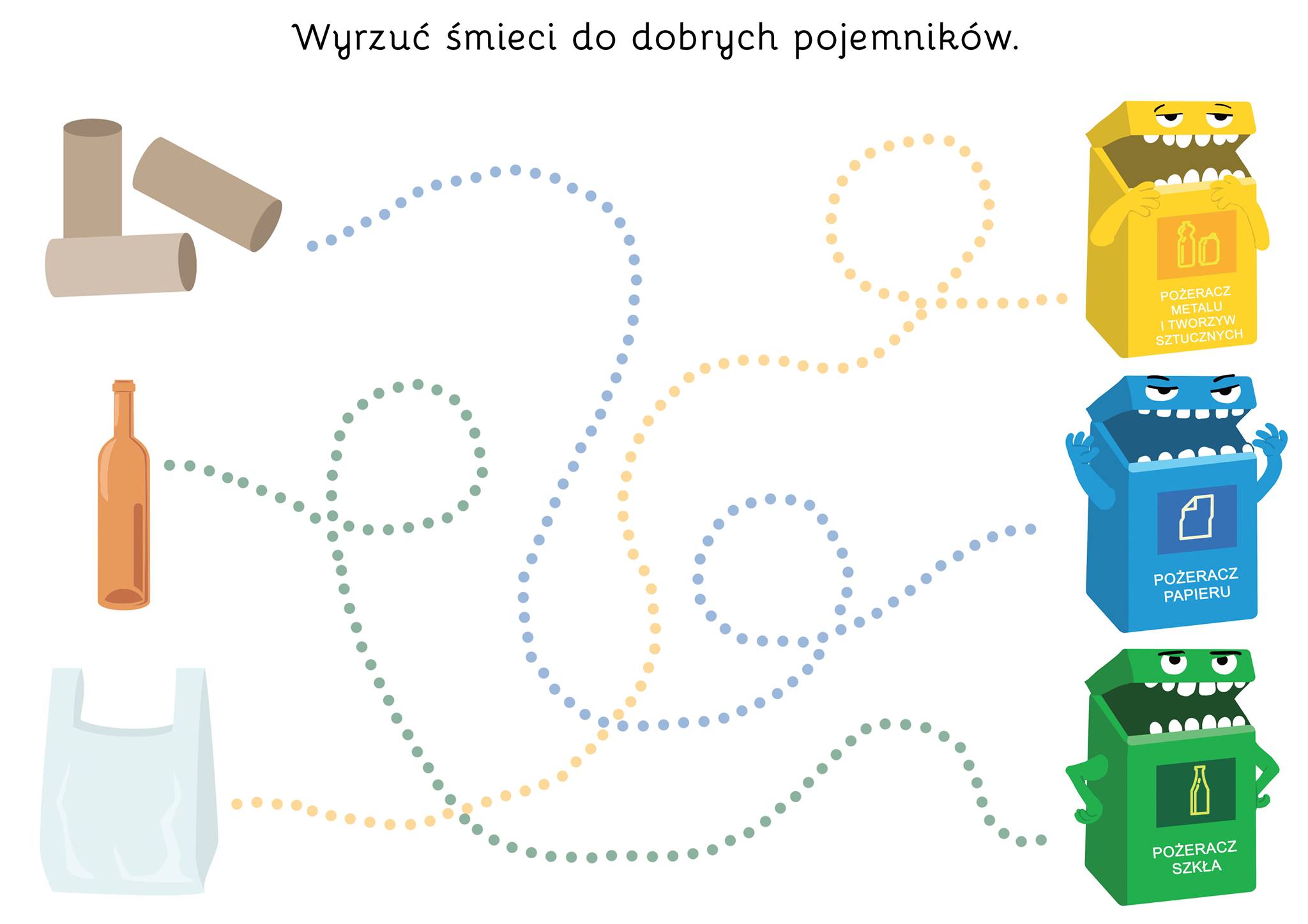 Rodzic przygotowuje przedmioty wykonane z plastiku, szkła i papieru, a zadaniem dziecka jest rozdzielenie ich do koszyków w odpowiednim kolorze