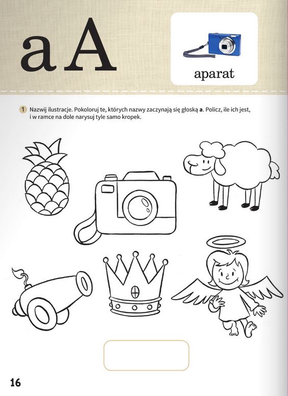 Przykładowe słowa na „A”: aparat, ananas, anioł autobus, aligator, apteczka, armata, akordeon, atrament, akwarium, album