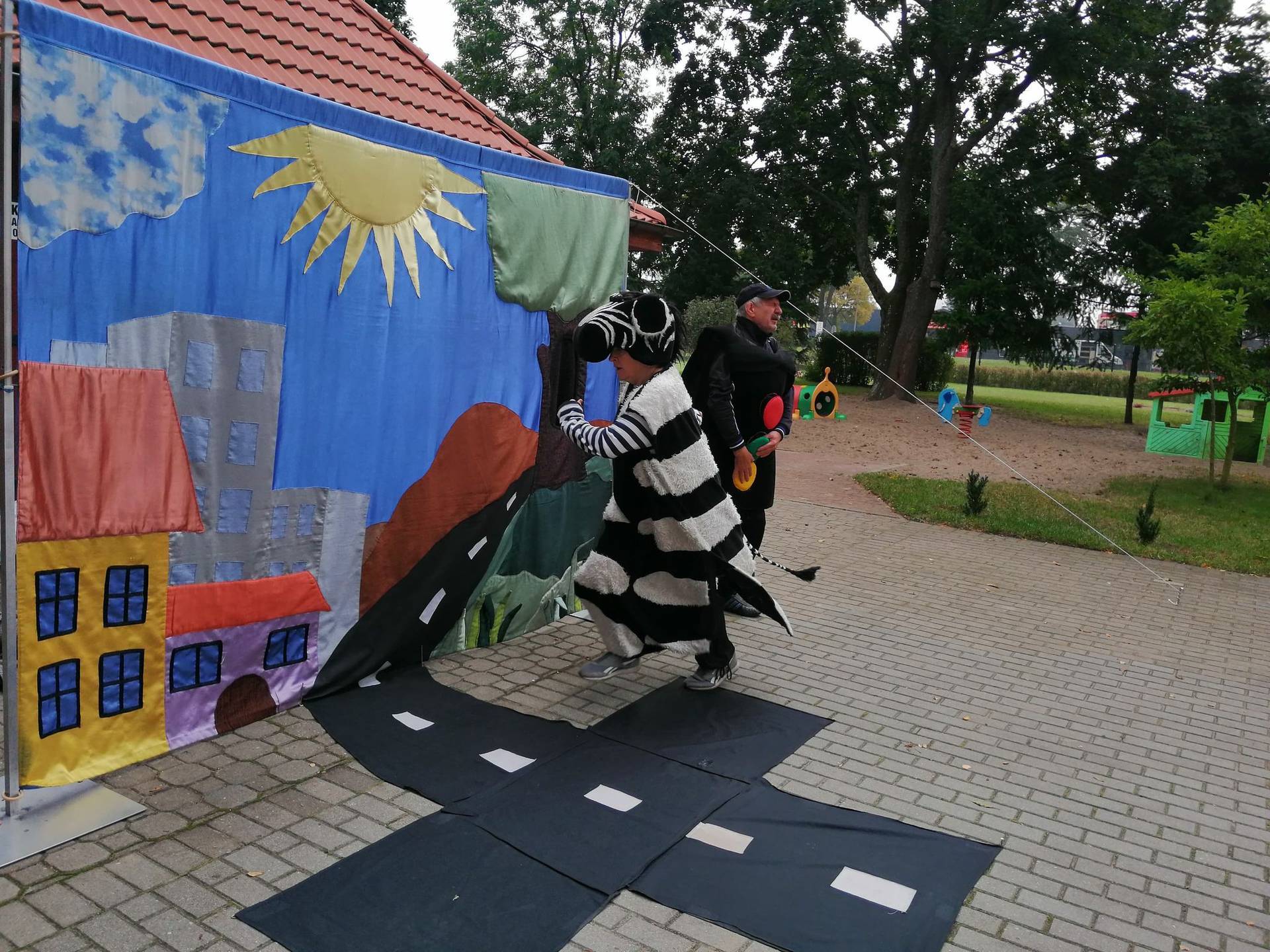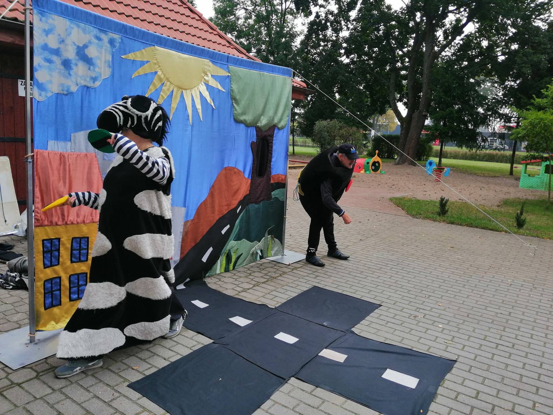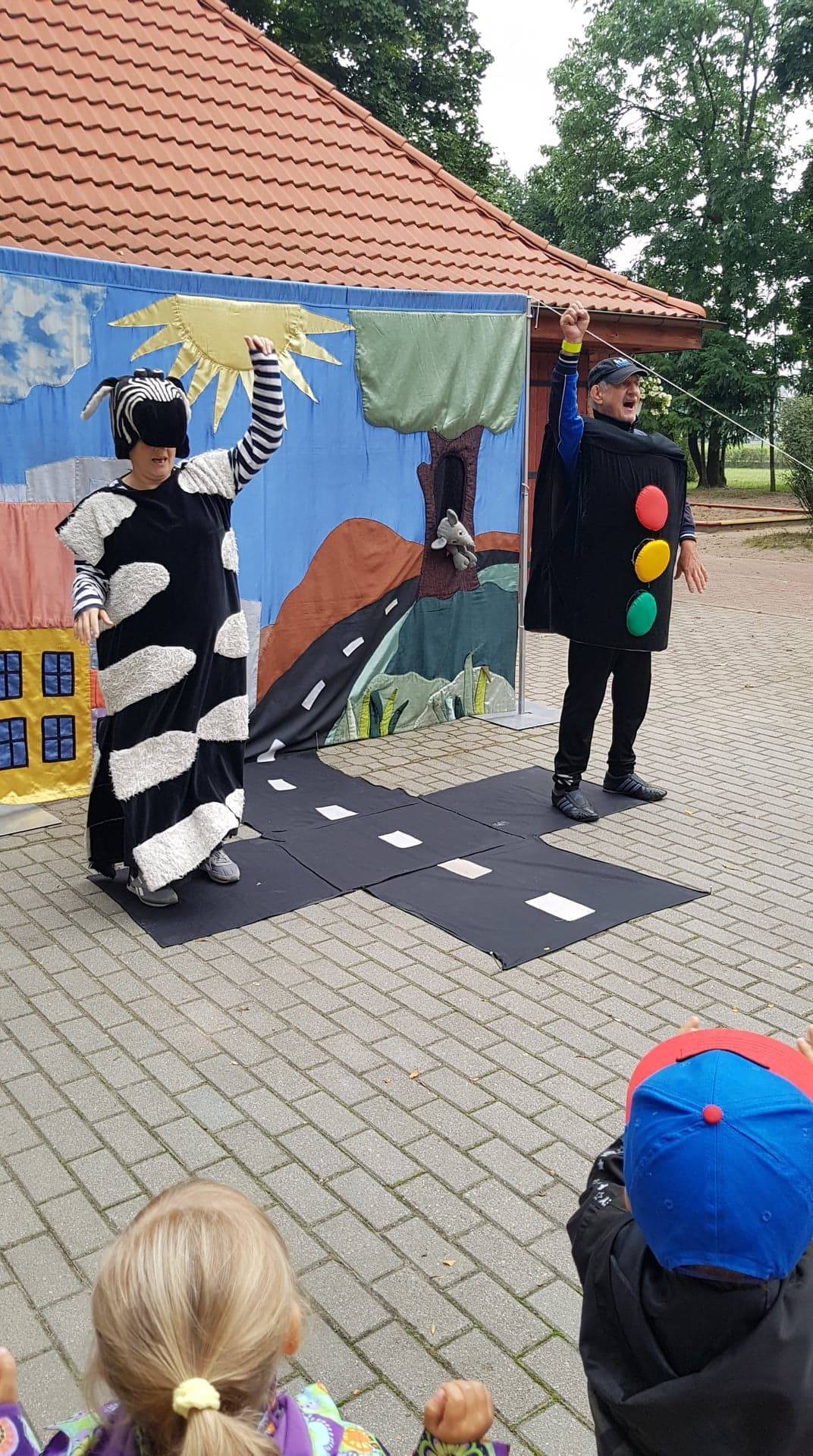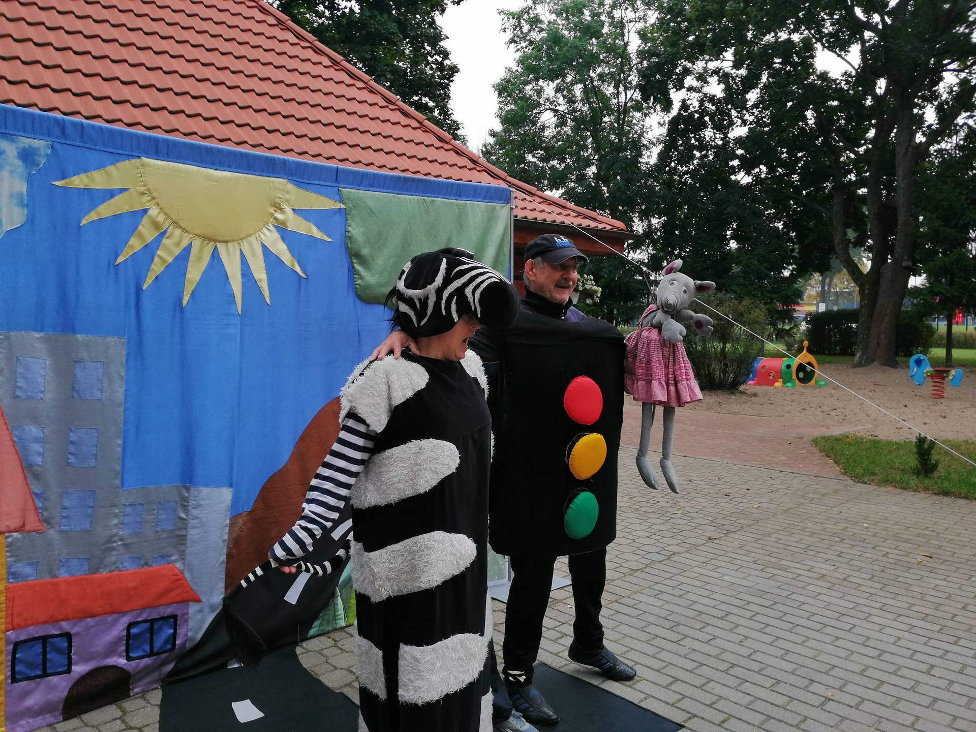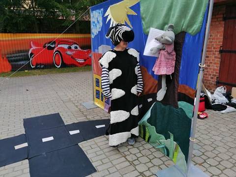 Bohaterowie teatrzyku: Szalona zebra, p. Sygnalizator i Nornica przypominali dzieciom podstawowe zasady ruchu drogowego.