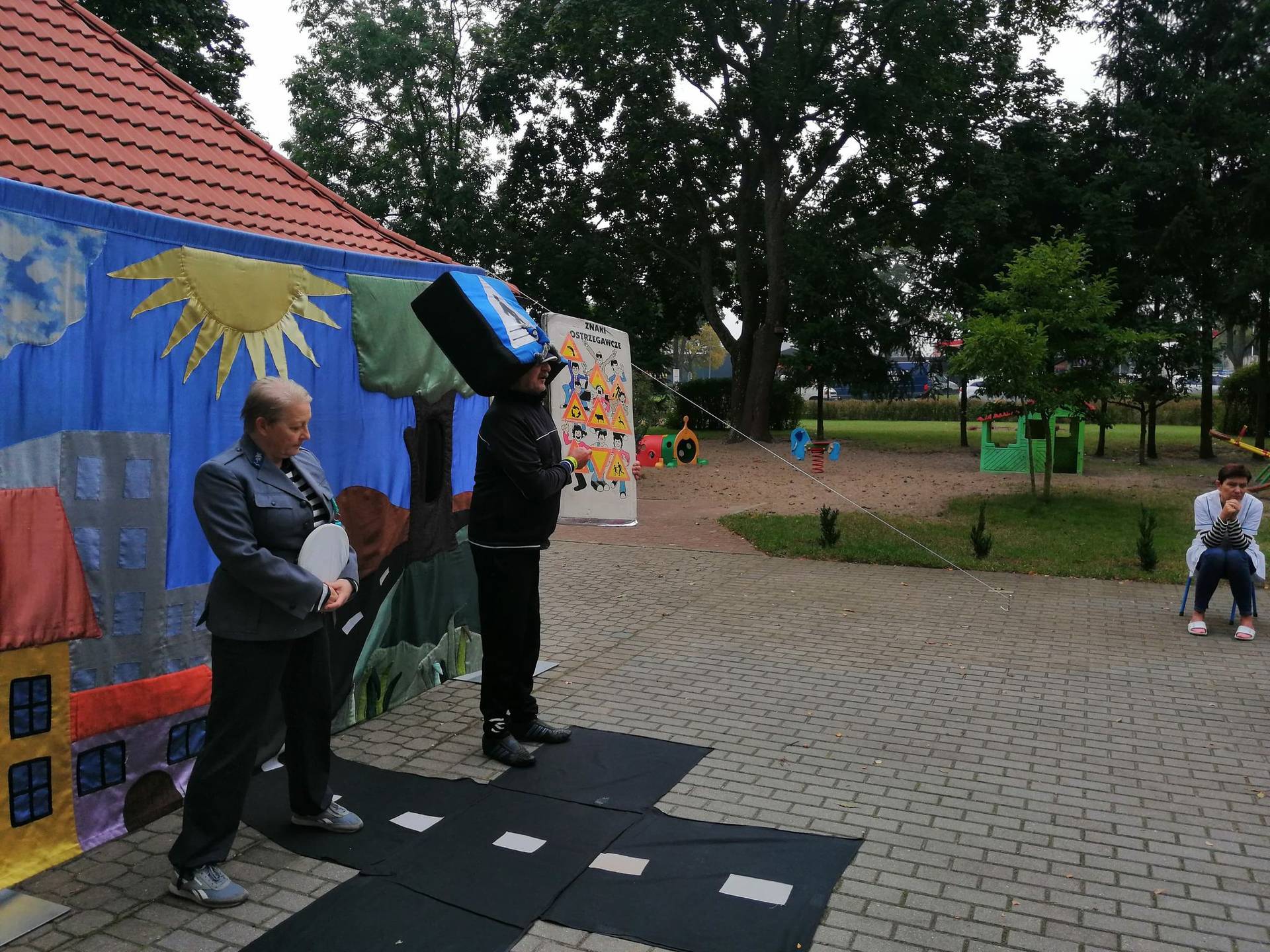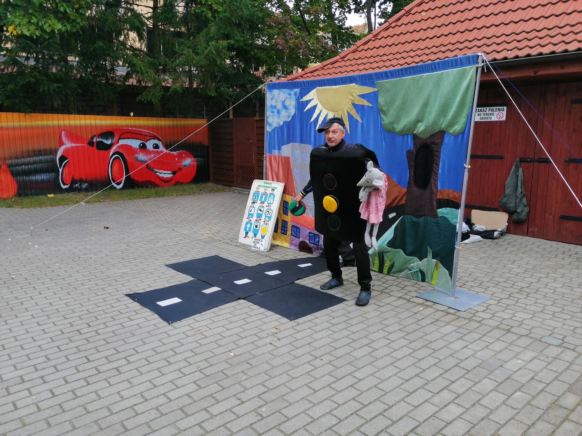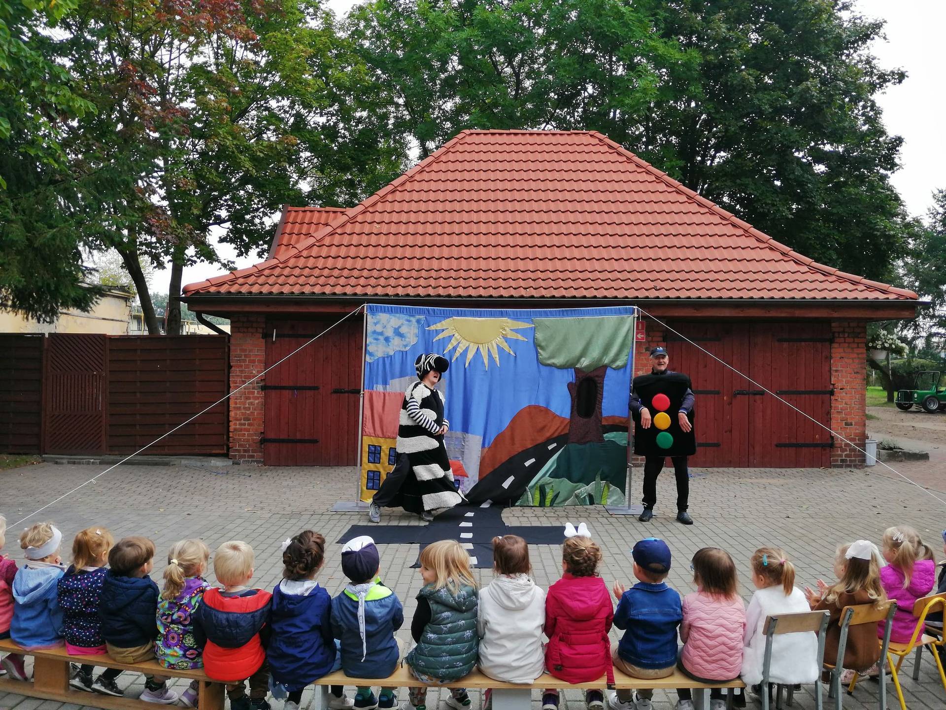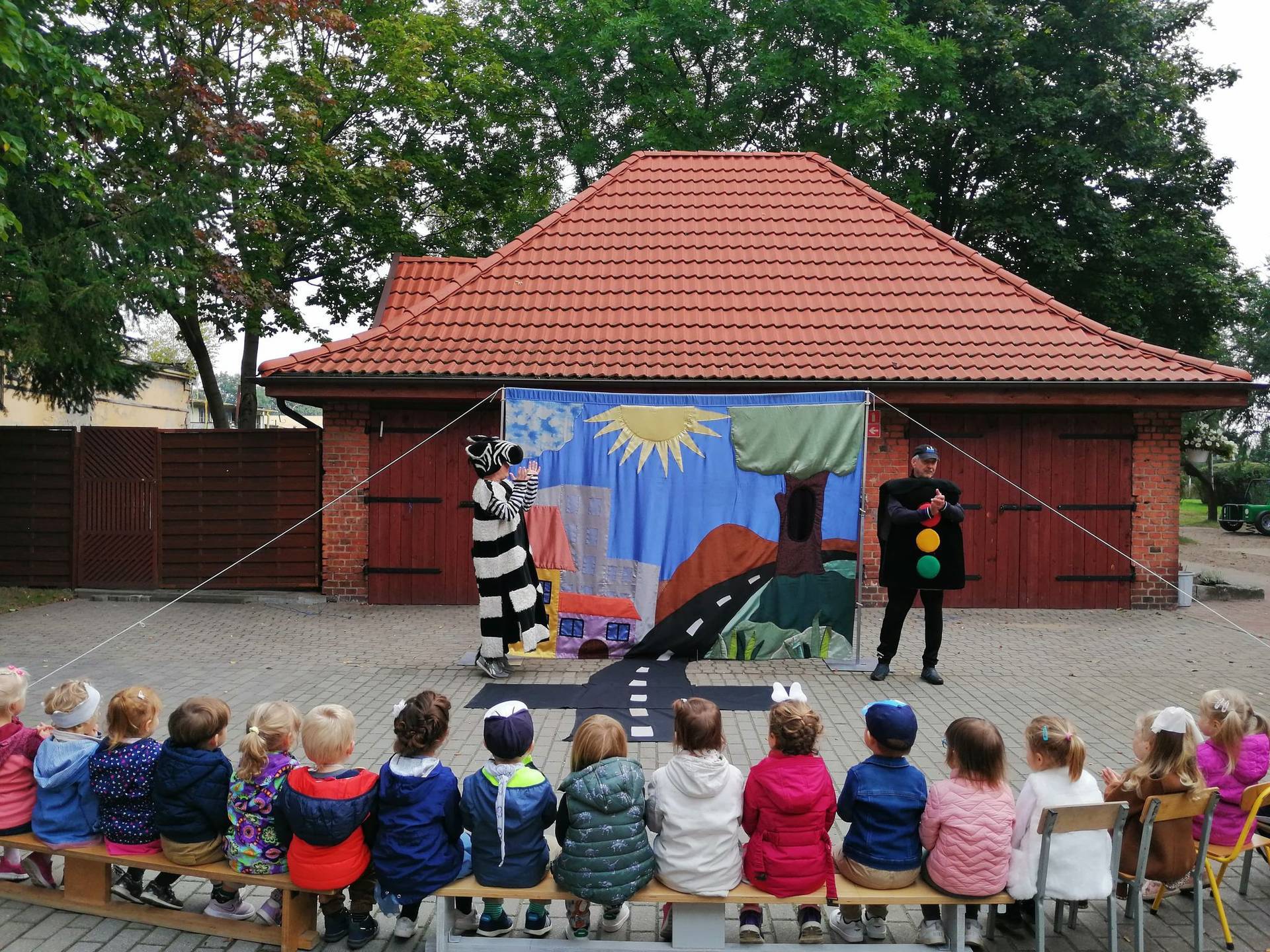 Bohaterowie teatrzyku: Szalona zebra, p. Sygnalizator i Nornica przypominali dzieciom podstawowe zasady ruchu drogowego.