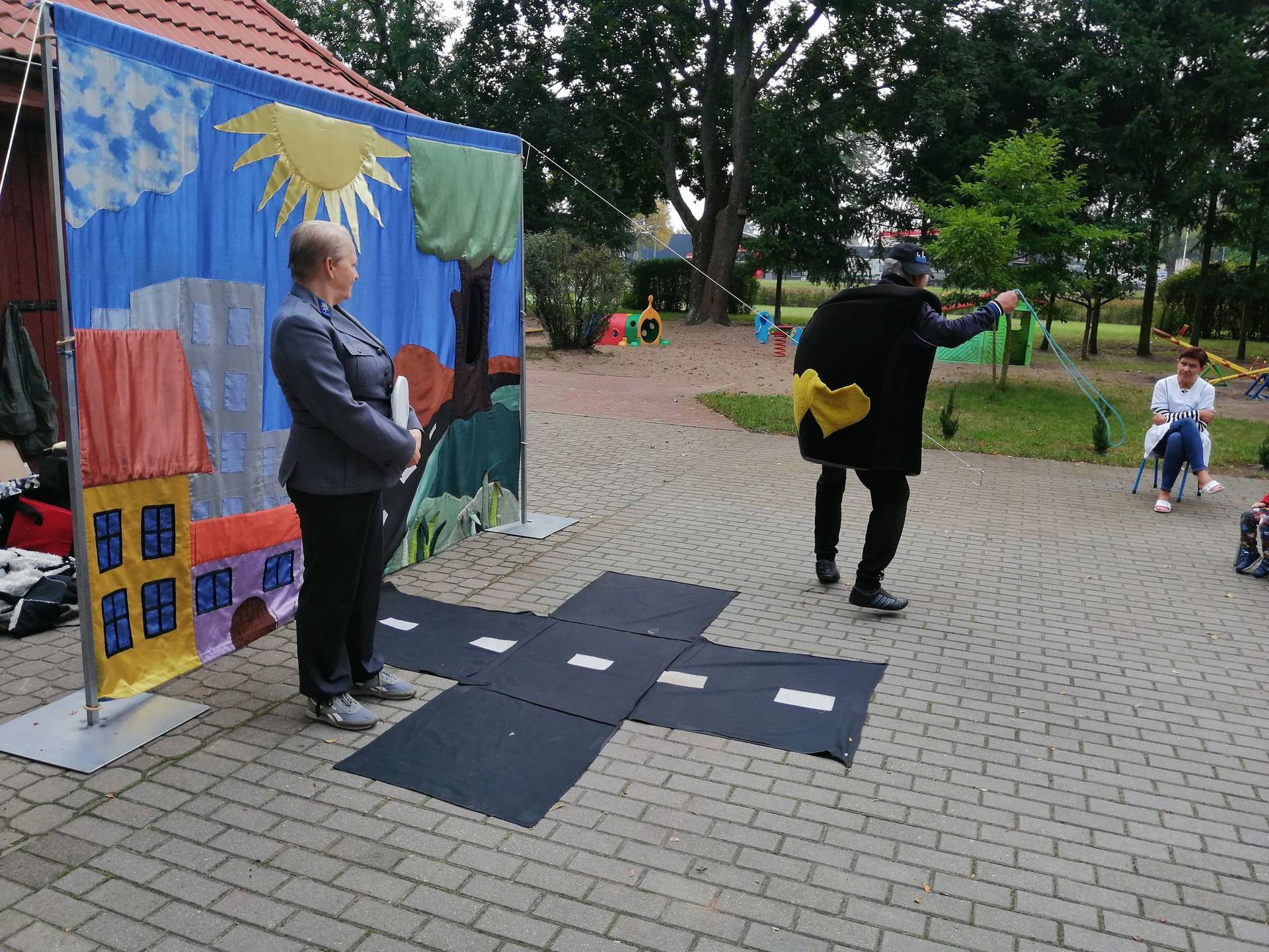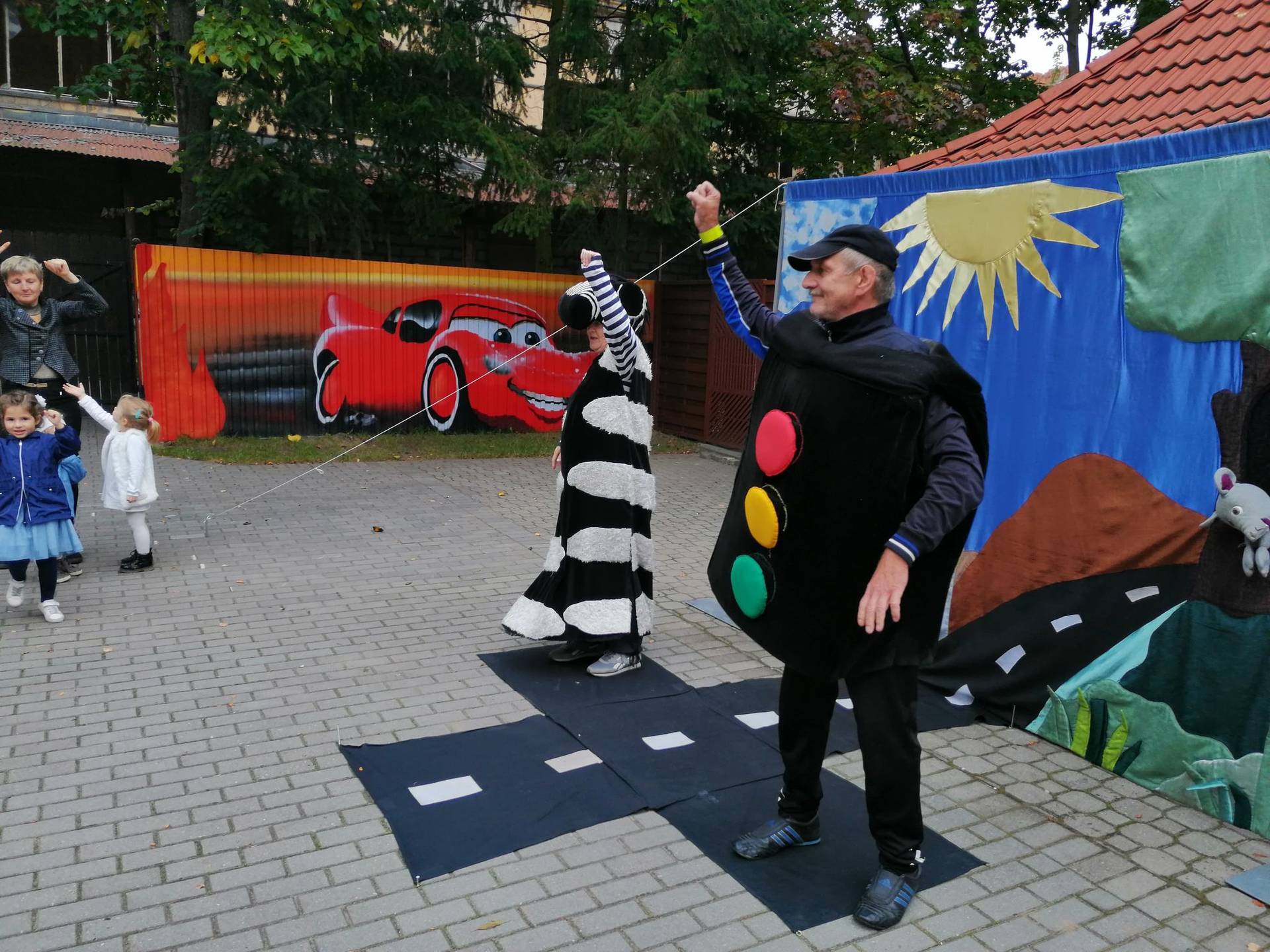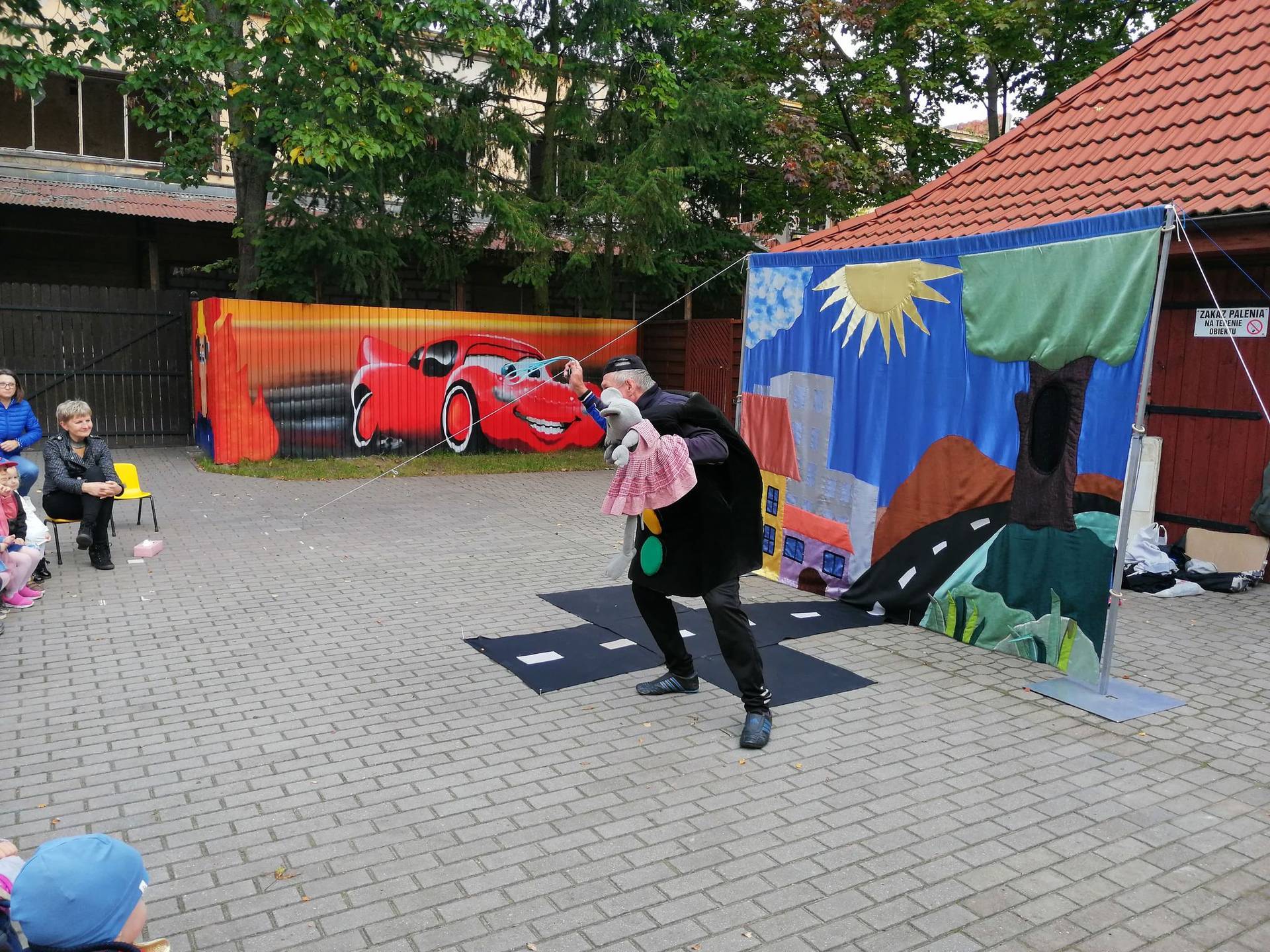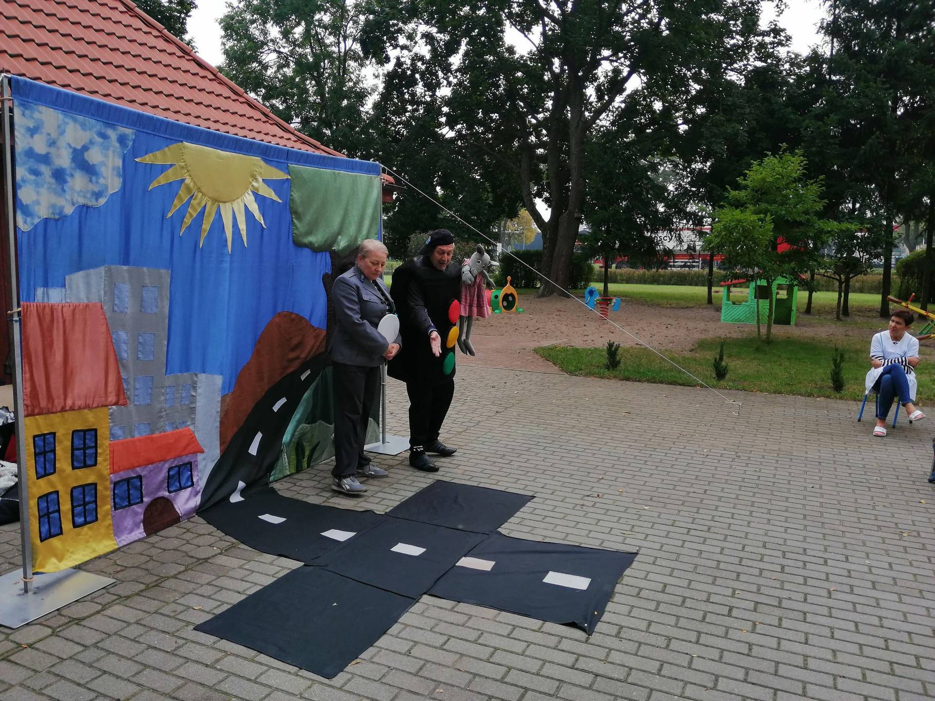Bohaterowie teatrzyku: Szalona zebra, p. Sygnalizator i Nornica przypominali dzieciom podstawowe zasady ruchu drogowego.