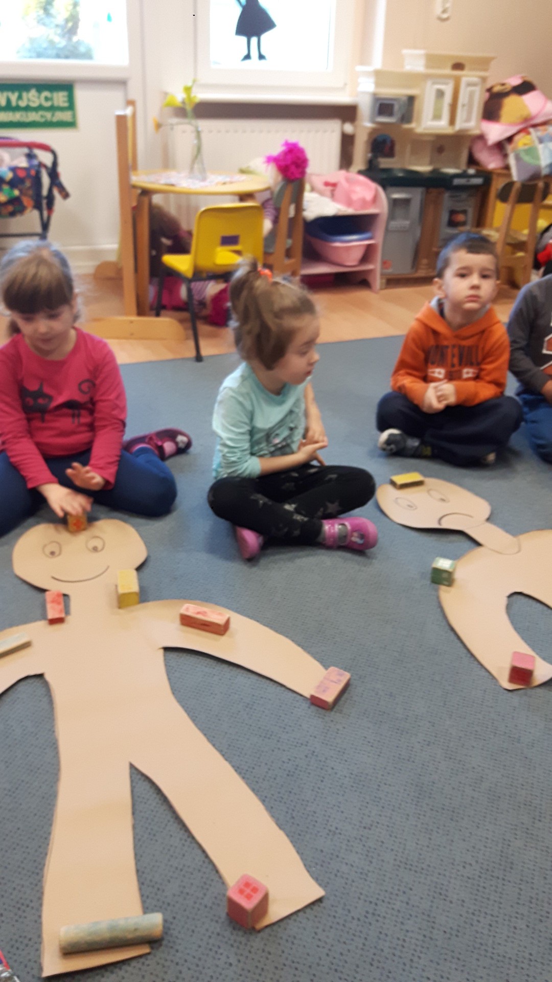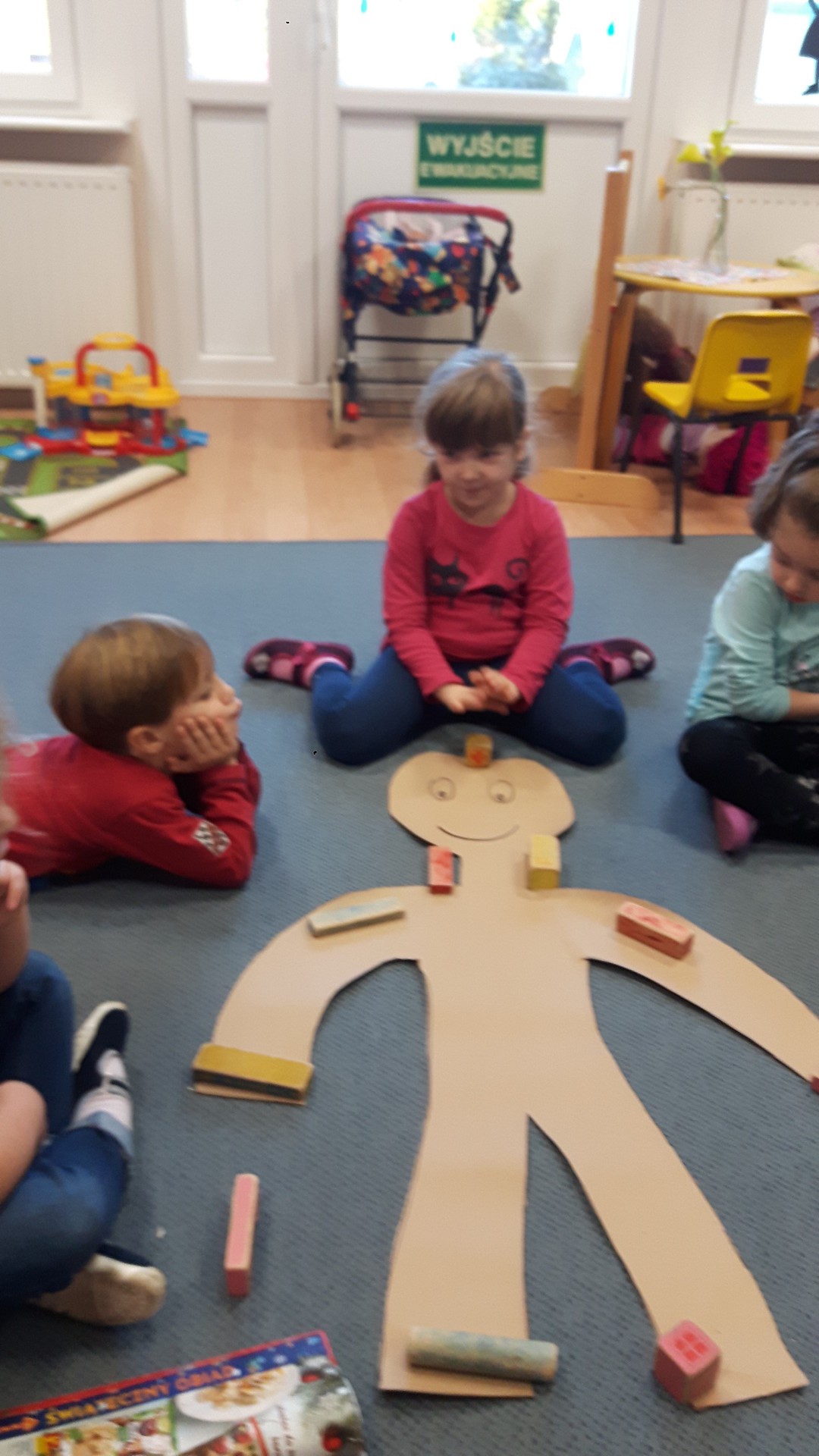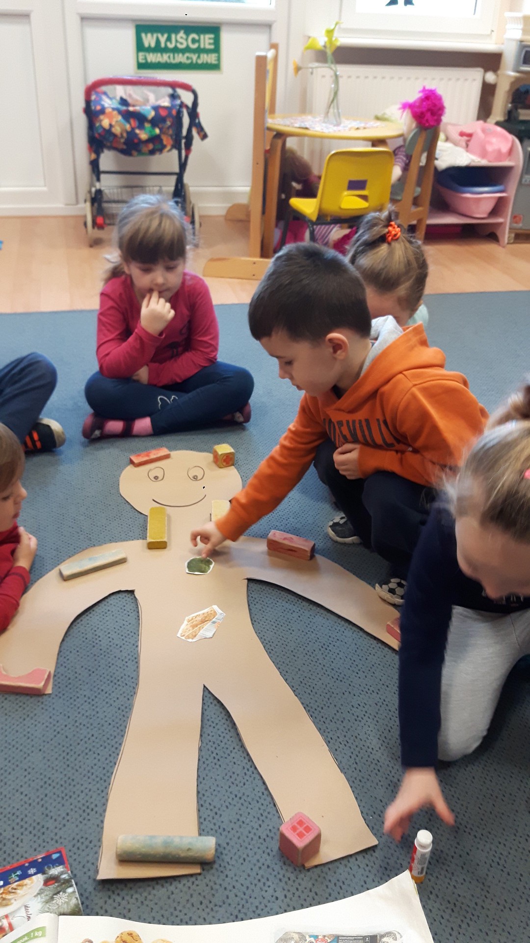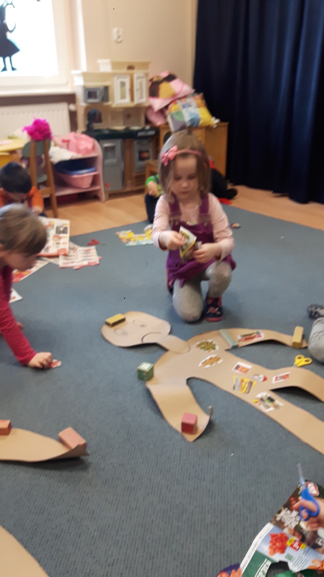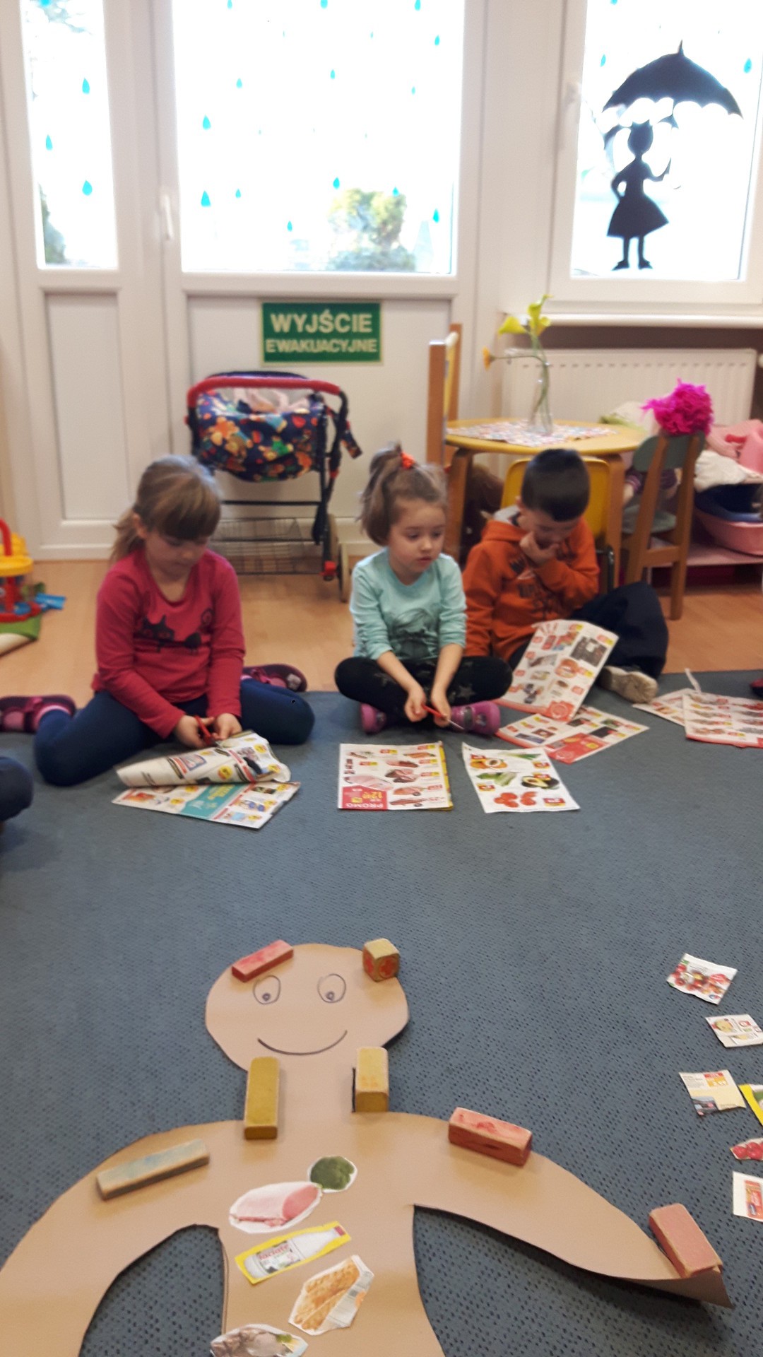Co jest zdrowe, co jest złe każdy doskonale wie”. Przedszkolaki dowiedziały się jak zdrowo się odżywiać, co należy często jeść, a czego unikać. Zapoznały się też z pojęciem „piramida zdrowia” – jak wygląda i co zawiera. W trakcie zabaw dzieci utrwalały zdobyte wiadomości. Wycinały obrazki z produktami spożywczymi, dzieliły je na zdrowe i niezdrowe, umieszczały we właściwych miejscach tworząc własną piramidę zdrowego żywienia.